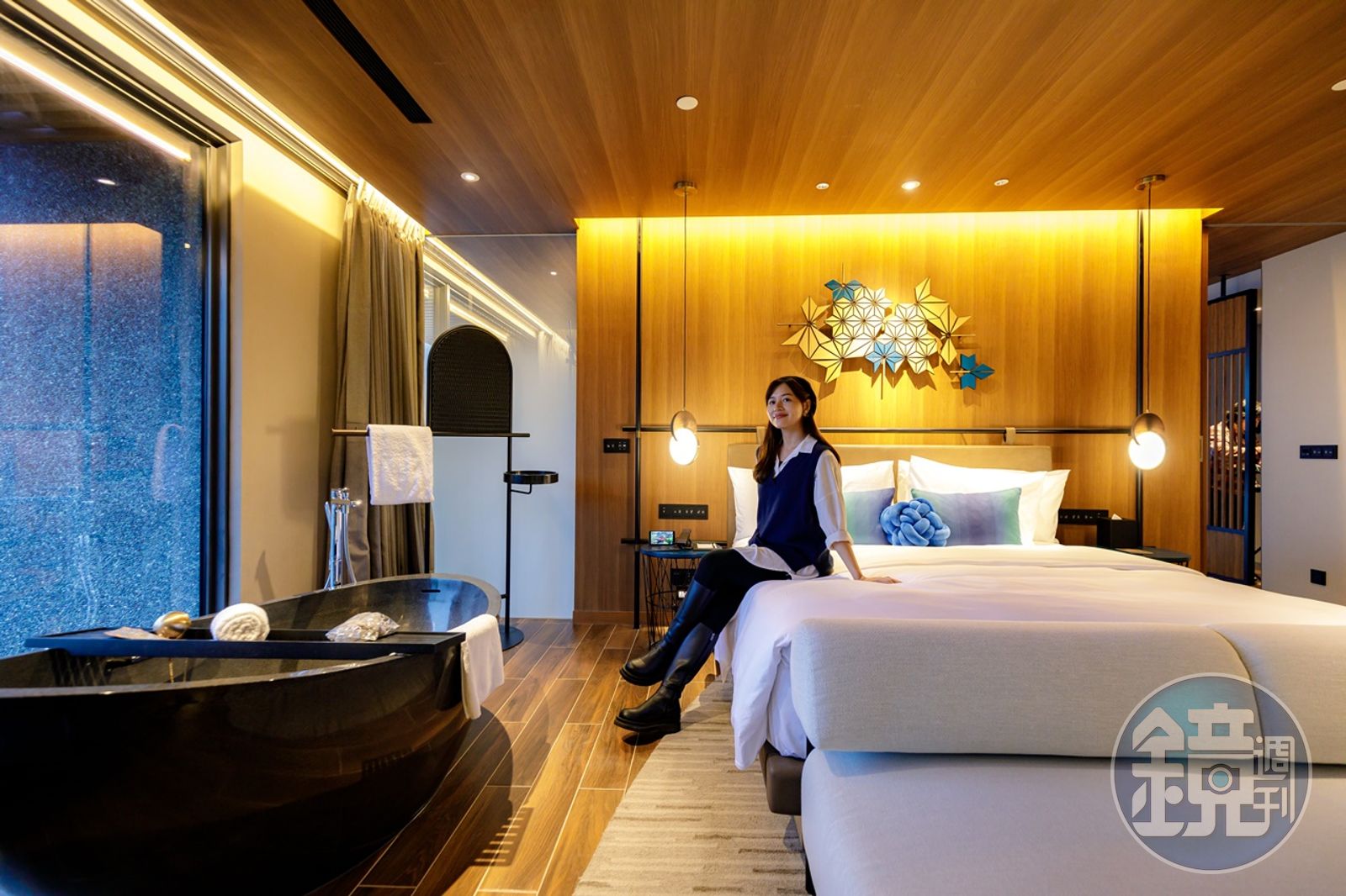 踏入大廳,竹林意象的裝置藝術映入眼簾,末端細微燈光入夜宛若如繁星滿天抑或夏夜的點點螢光,再往前走,一座「幾何隧道」連結大廳與梯廳,隨著步伐前進,先是聽見腳踏楓葉林聲,接著是搗小米聲響,台灣藍鵲啼叫聲也隨之到來,不僅營造視覺意象,飯店團隊巧妙運用聲音打造情境,讓旅人用五感感受山林。
