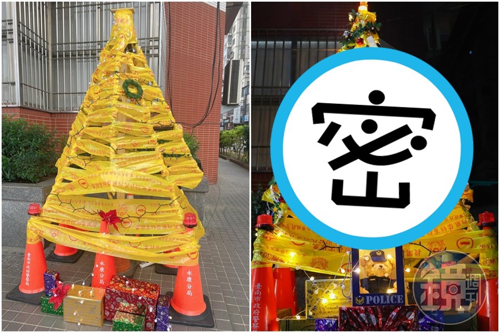 一名網友上週五(16日)在臉書社團「路上觀察學院」分享一棵在台南永康分局復興派出所外,外型相當特別的耶誕樹。照片中可看出耶誕樹底座用橘色三角錐組成,以竹竿當做骨架,並纏繞黃色封鎖線,下方還擺放應景的禮物裝飾,瞬間成了派出所版的創意耶誕樹。
