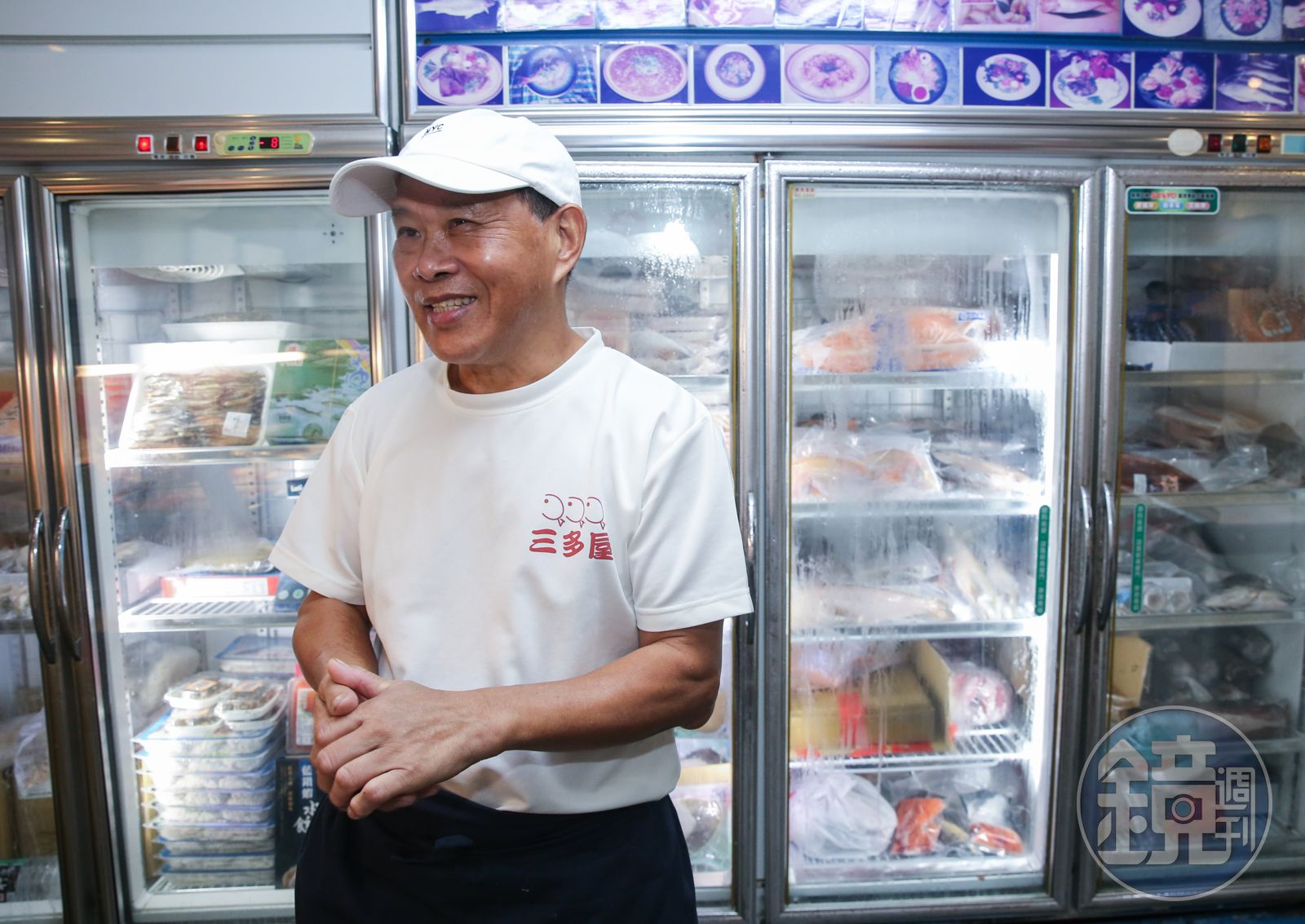 三多屋國際能依客人預算配生魚片,且皆由老闆李奕立站切台親自服務。(圖為500元/份)李奕立笑著解釋:「因為冰箱關太大力,會影響裡面的溫度,外面的熱空氣會被帶到裡面。」也因為標準高,他才能毅屹立台北海鮮批發界50年,所開餐廳,大排長龍。