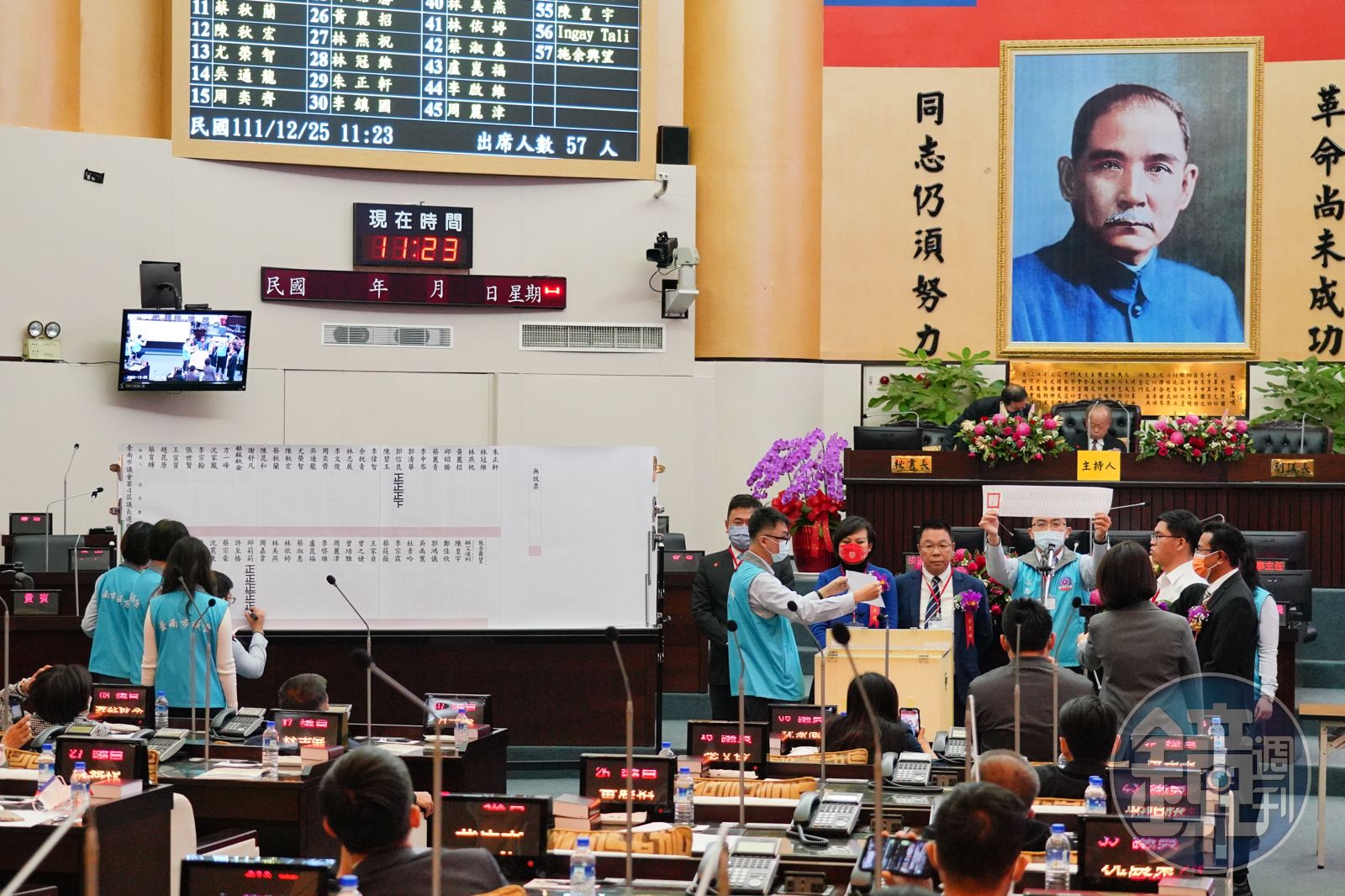 另一方面,台南市議長選舉也出現跑票情況,國民黨團議員李文俊、李鎮國、張世賢3人轉投民進黨籍的邱莉莉,加上民進黨28席全員團結,最終由邱莉莉順利當選。其中原先被國民黨支持連任副議長的李文俊,本次則輸給民進黨的林志展。