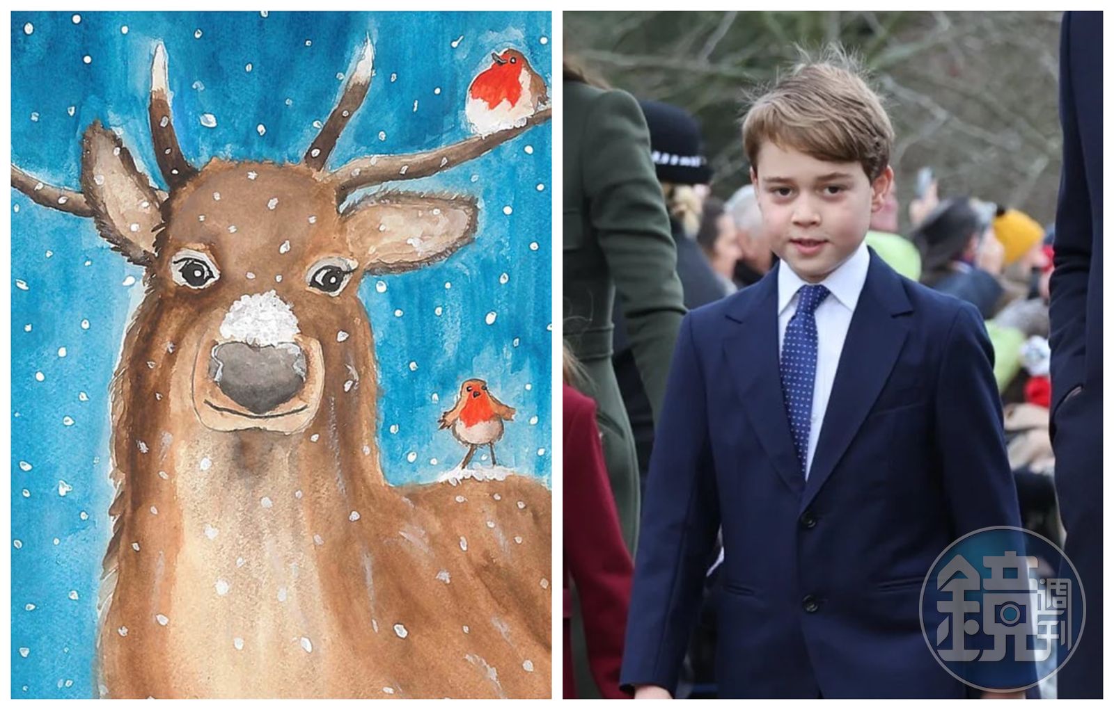英國白金漢宮和肯辛頓宮25日在官方社群網站貼出喬治小王子的水彩畫,他畫了一隻馴鹿,細看馴鹿的鼻頭上沾了一堆雪,鹿角和背上站了兩隻小知更鳥。馴鹿微笑,眼神充滿靈性,作品用色優雅,相當溫暖。