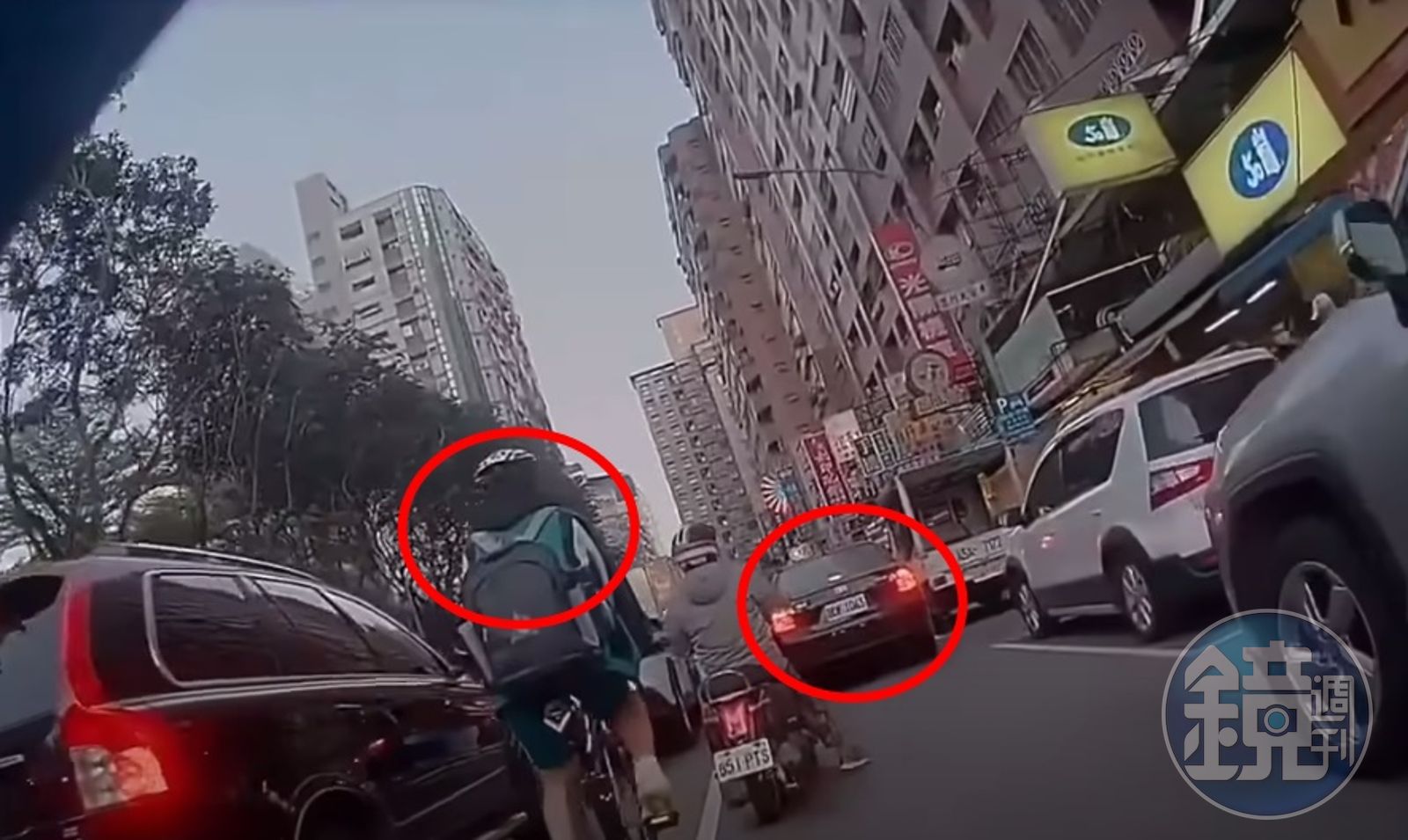 因為該車違規,不少機車、單車必須繞道而行,甚至與旁邊車道的汽車僅有一線之隔,相當危險;沒想到一名身穿運動服,騎著單車的弟弟經過違停車輛,冷不防「非常用力」拍下該車的後照鏡,後照鏡當場反折,單車弟弟則是往後一瞥,加速離開。