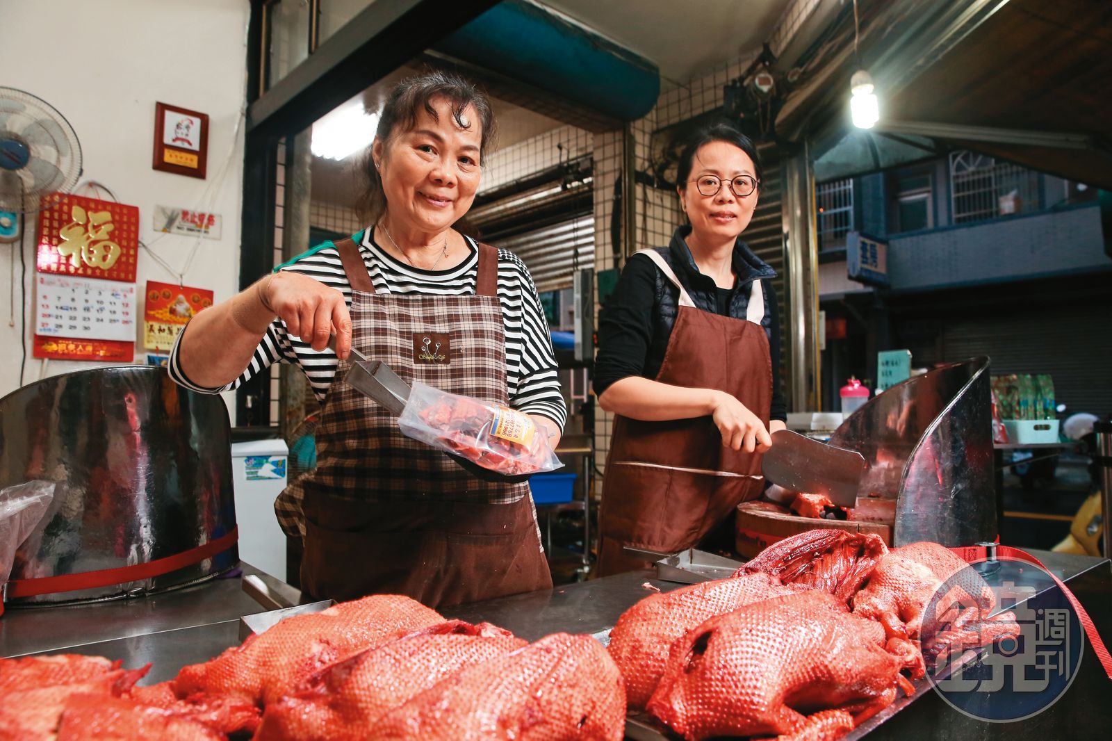 母女分工,另一頭,鄧淑姿把熟成紅糟鴨從醬缸中撈起,天然紅麴將食材染上紅冬冬的討喜色澤。戴瑞瑩接手剁肉;鄧淑姿把煮雞鴨的原湯加工處理,舀起表層厚油、燒乾水分,成為單獨販售的鴨油,也取部分高湯熬桂竹筍,其餘放涼後分裝,當作客人買肉送湯的小確幸。靠物盡其用、一點一滴積攢,鄧淑姿幫已逝丈夫償還千萬元債務、送孩子出國念書圓夢,撐起了一大家子。
