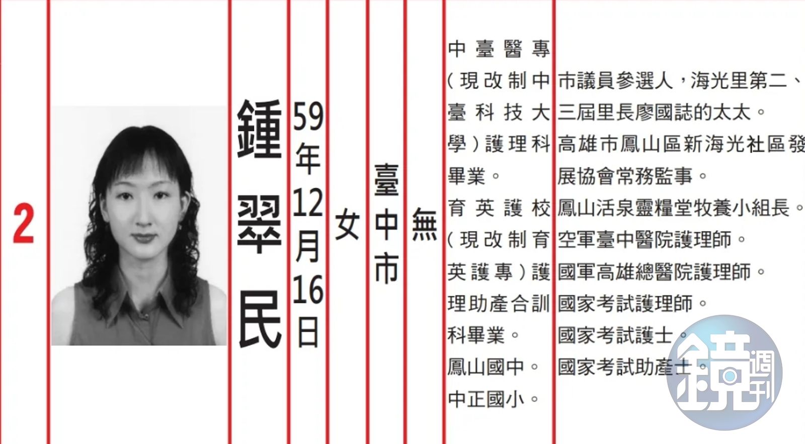 高雄鳳山區海光里長當選人鍾翠民,今年與參選鳳山區市議員的前海光里長廖國誌是夫妻,丈夫改選市議員,老婆則接棒參選里長位置,最終老婆當選、丈夫挑戰議員失利。但事後爆出鍾翠民原是在高雄某軍醫院擔任護理師,最後因不便兼職為由,遞交不就職聲明書。