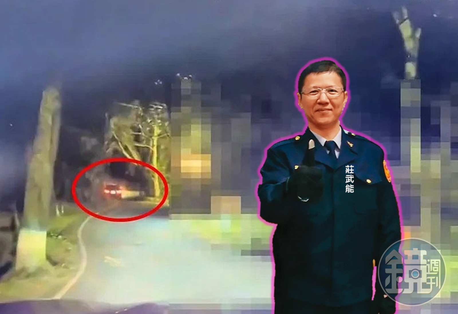 莊武能(小圖)被因涉及恐嚇取財案遭逮,還拒絕下車配合,並開車衝撞警車逃逸(紅圈處),遭連開9槍制止就逮。(大圖翻攝畫面,小圖翻攝苗栗縣警局粉絲頁)發布時間:2023.01.03 05:58 臺北時間
