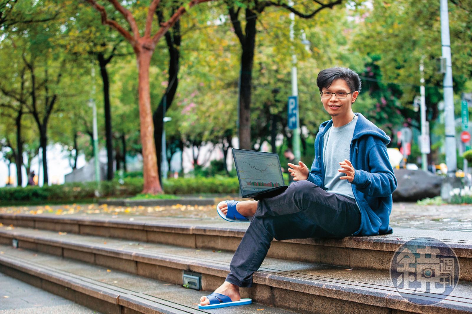 採訪拍照時,郭靖新將腳上的鞋子換上熟悉的藍白拖,不經意地說:「啊,舒服多了。」逗得現場人員哈哈大笑,隨後他認真地補上一句:「其實投資的過程,就要像穿藍白拖鞋一樣,舒適、實用、方便。」