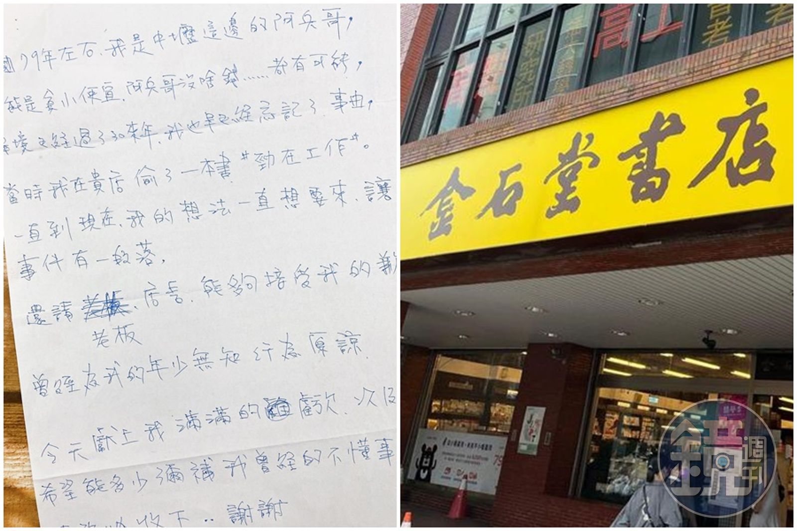 金石堂小編3日在臉書粉專透露,金石堂2022年年末收到了一封信署名「中壢阿兵哥」的道歉信,當事人自白30多年前因為一時貪小便宜,在店裡偷了一本書《勁在工作》,信中寫道「民國79年左右…我在貴店偷了一本書。可能是因為貪小便宜、可能是因為阿兵哥沒什麼錢,過了30來年,我早已經忘記了事由,但直到現在,我一直想讓這件事有一個段落。」他在信中夾帶3,000元現金,盼老闆能接受他的道歉,為當年的不懂事買單。