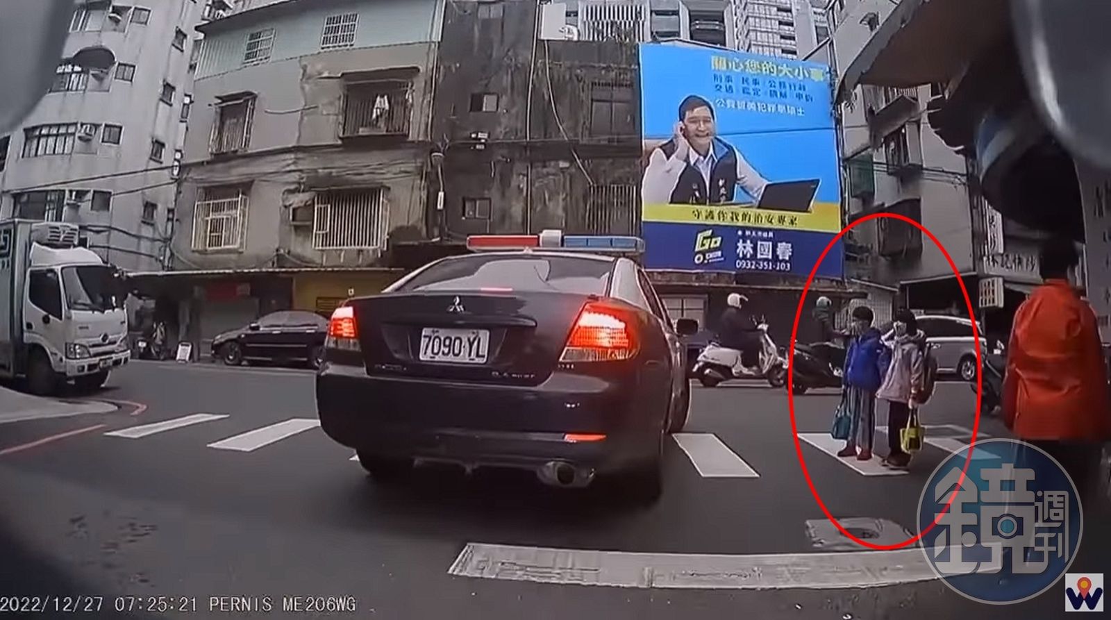 畫面顯示,該路口畫有枕木紋行人穿越道,一旁2名正準備上學的學童已踏上穿越道正要過馬路,然而這時一輛警車從街道駛出,稍微踩了剎車,確認主幹道沒車後就直接右轉開過,並未禮讓正要過馬路的2名學童。後方記錄下全程的駕駛則先讓學童通過後才通行。