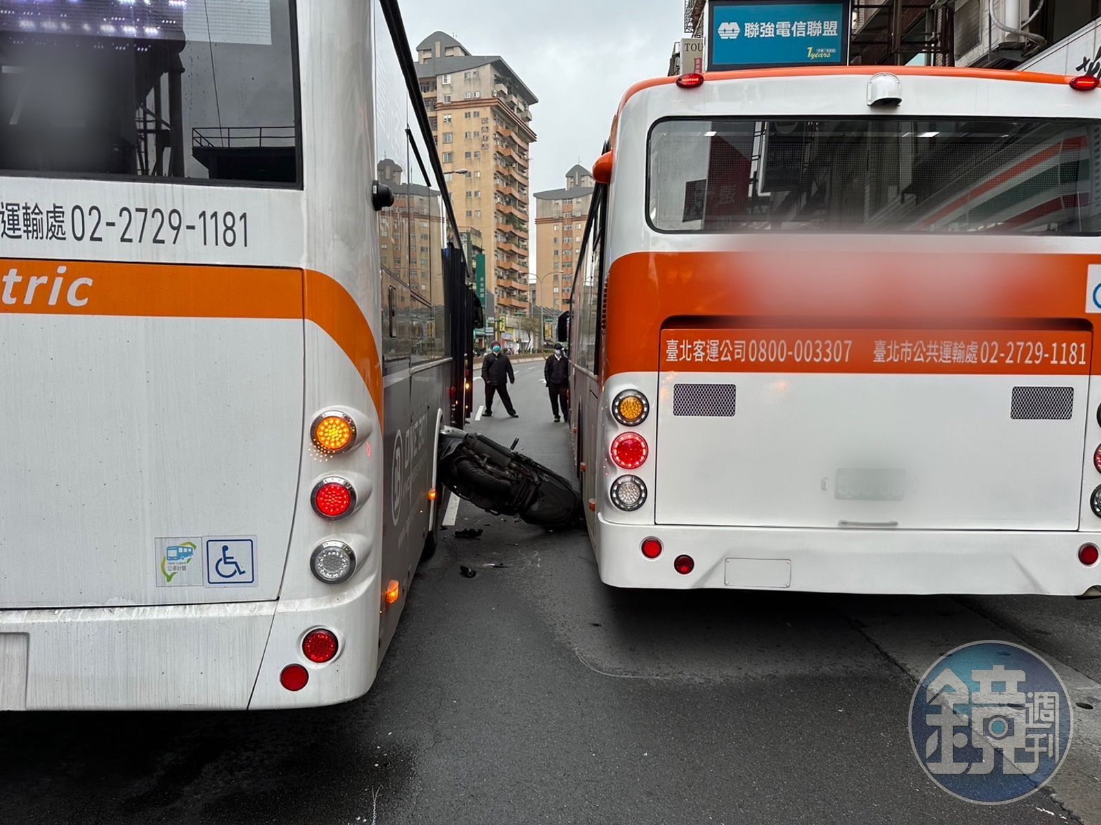 李姓女騎士因超車不慎,連人帶車夾在2部公車中間。(翻攝畫面)發布時間:2023.01.05 17:38 臺北時間