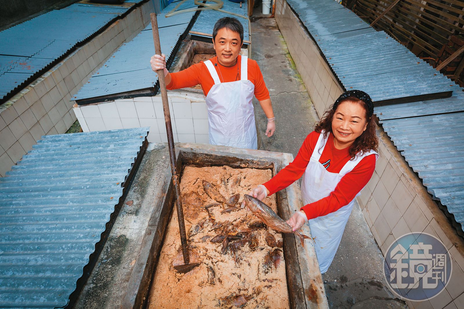 賴貴玉與郭宥森帶記者穿過民星狹長的店面,後頭魚露發酵區占地至少百坪,別有洞天,四排古董級水泥發酵槽共三十多槽,每槽深度達220公分,槽中鯖魚正在天井區做日光浴,郭宥森持棒攪動發酵槽,讓上下層鯖魚均勻發酵,「日曬是為了除雜菌和濕氣,鮮味會提升30倍。」