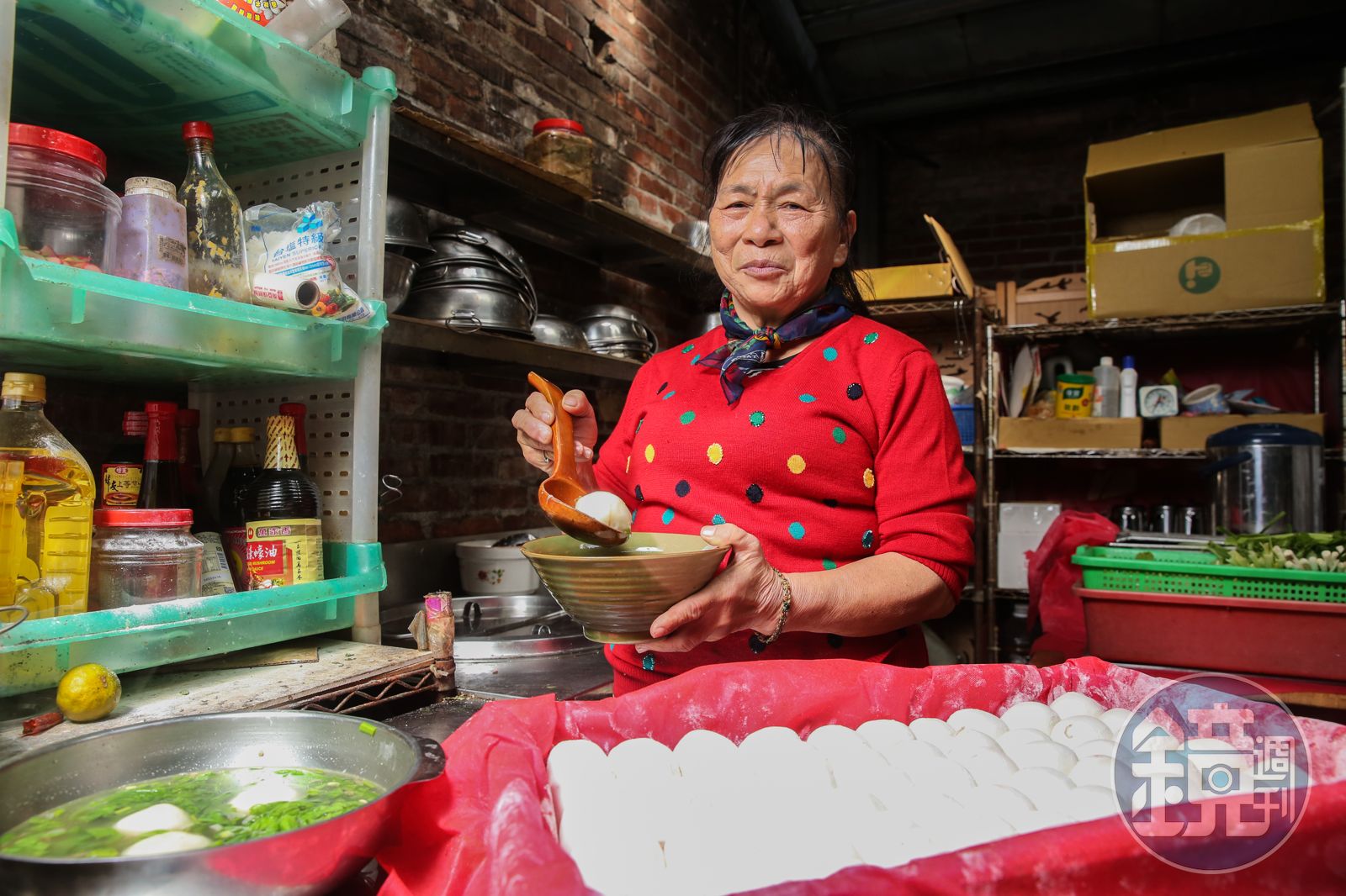 湯圓體積幾乎是幼兒拳頭大,內餡有香菇、豬絞肉、蘿蔔絲、菜脯,「要煮十幾分鐘。湯頭是用大骨熬的,我們也用來燙雞肉,所以很甜。」湯圓入口Q軟鹹香,滋味豐富,即便是成年男子,吃二顆就有飽足感。