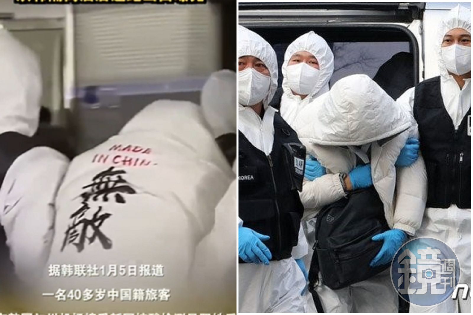 南韓警方將中國男子帶回時,也開放讓媒體拍攝,只見男子全身白衣,並用外套帽子把頭部遮緊緊。此外,男子身上最外頭的白色羽絨衣,背後還印著「Made in China無敵」顯得格外醒目,也引發網友議論紛紛,但大多數網友都說:「背後的字太諷刺了!」、「丟臉。」、「希望南韓警方能好好治治他。」據悉這名男子在南韓完成7日隔離後,極有可能直接被遣送回中國,而且未來短時間內無法再進入南韓。