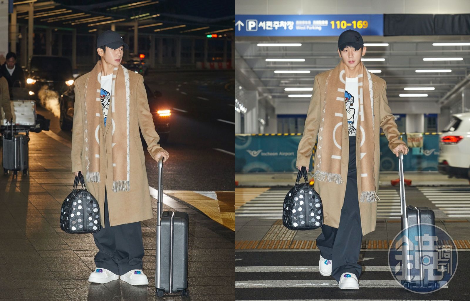 清早摸黑起床出門的丁海寅看來沒有因為行程太早而睡眼惺忪(年輕人身體好),神采奕奕的他身穿卡通圖案針織上衣與灰色寬褲,搭配駝色雙排扣修身大衣及同色系Louis Vuitton標誌圍巾,手提Louis Vuitton X草間彌生Keepall 55旅行袋及Horizon 55黑色行李箱,帥氣十足。