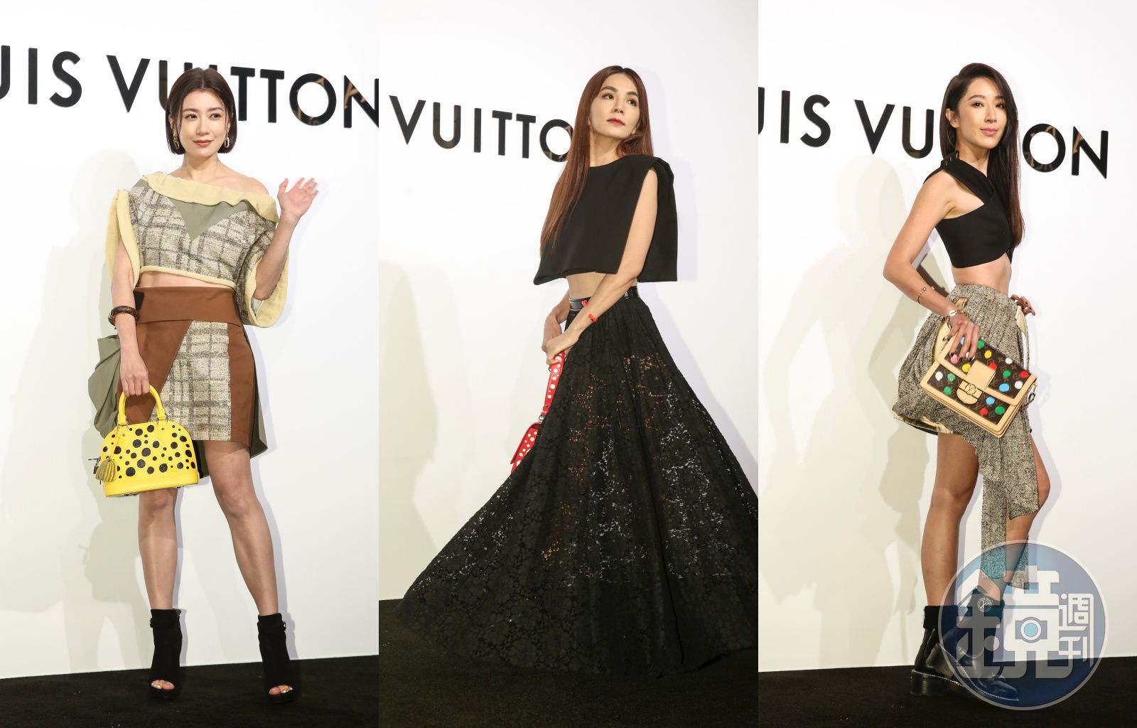 隋棠的LV行頭包括棉質斜紋布交叉帶上衣NT$83,500、金色A字迷你半截裙NT$79,000、垂摺麻布層次半截裙NT$141,000、LV X 草間彌生Dauphine肩背包NT$133,000。 郭雪芙身上的LV金銀絲粗呢修腰闊身上衣NT$92,500、金銀絲粗呢短裙未定價、LV X 草間彌生Sidetrunk黑色立體銀色金屬圓點肩背包NT$223,000。 賈靜雯頂了一頭剛剪的短髮出席活動,她開玩笑表示,「很怕正在綜藝節目《來吧!營業中》裡化身美髮師的修杰楷動刀,所以我乾脆先剪短,因為女兒都不給他碰,他只好拿我的頭髮練習吹,結果我髮尾都毛毛的了」。