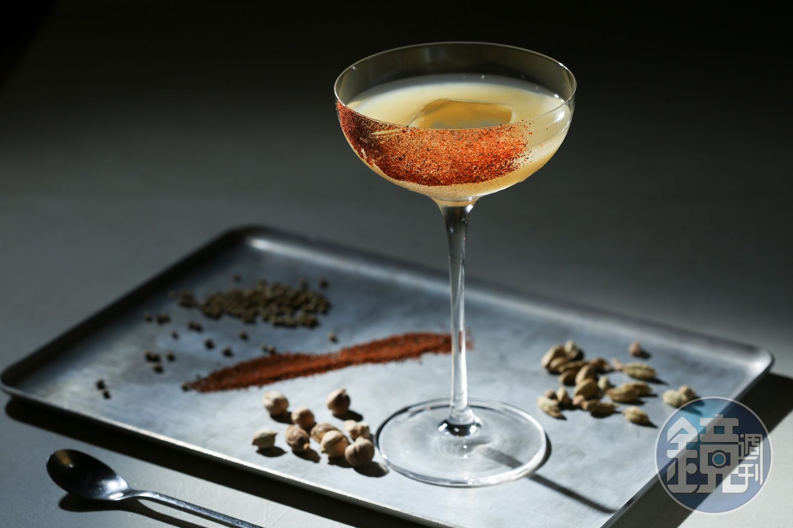 另一款超人氣的「金色沙丘」,靈感來自Pei喜歡的電影《沙丘》中沙漠與香料的概念。加入南投白茶、琴酒,白豆蔻精油感的木質調、荔枝的香甜以及杯口一抹鹽、糖、煙燻紅椒粉與鐵觀音茶粉的嫣紅,竟迸發蜜桃香與柴魚的鹹鮮,就像沙漠中的貴族。