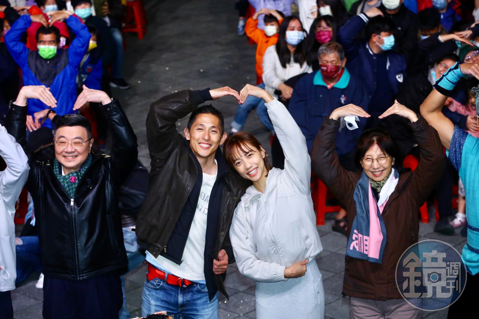 除了邀來父母吳乃德、林惠英來助陣,吳怡農今也和太太顏采薇一起同台,兩人雙手比出大愛心放閃,並和民進黨前黨主席卓榮泰一同提著糖果籃發糖果,場面相當熱絡。