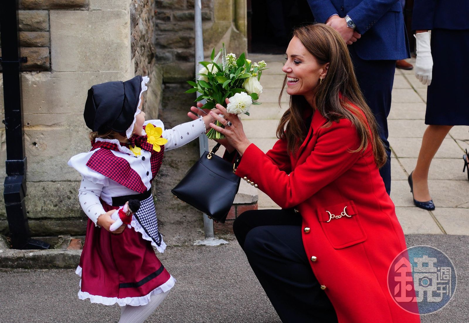 當天凱特穿著一身LK Bennett紅色外套,外套名字外套的名字是「Spencer」,正式已故婆婆黛安娜王妃的姓氏。凱特是繼黛妃之後,第一位使用「威爾斯王妃」頭銜的王室成員,用這身紅衣向婆婆致意,相當聰明。