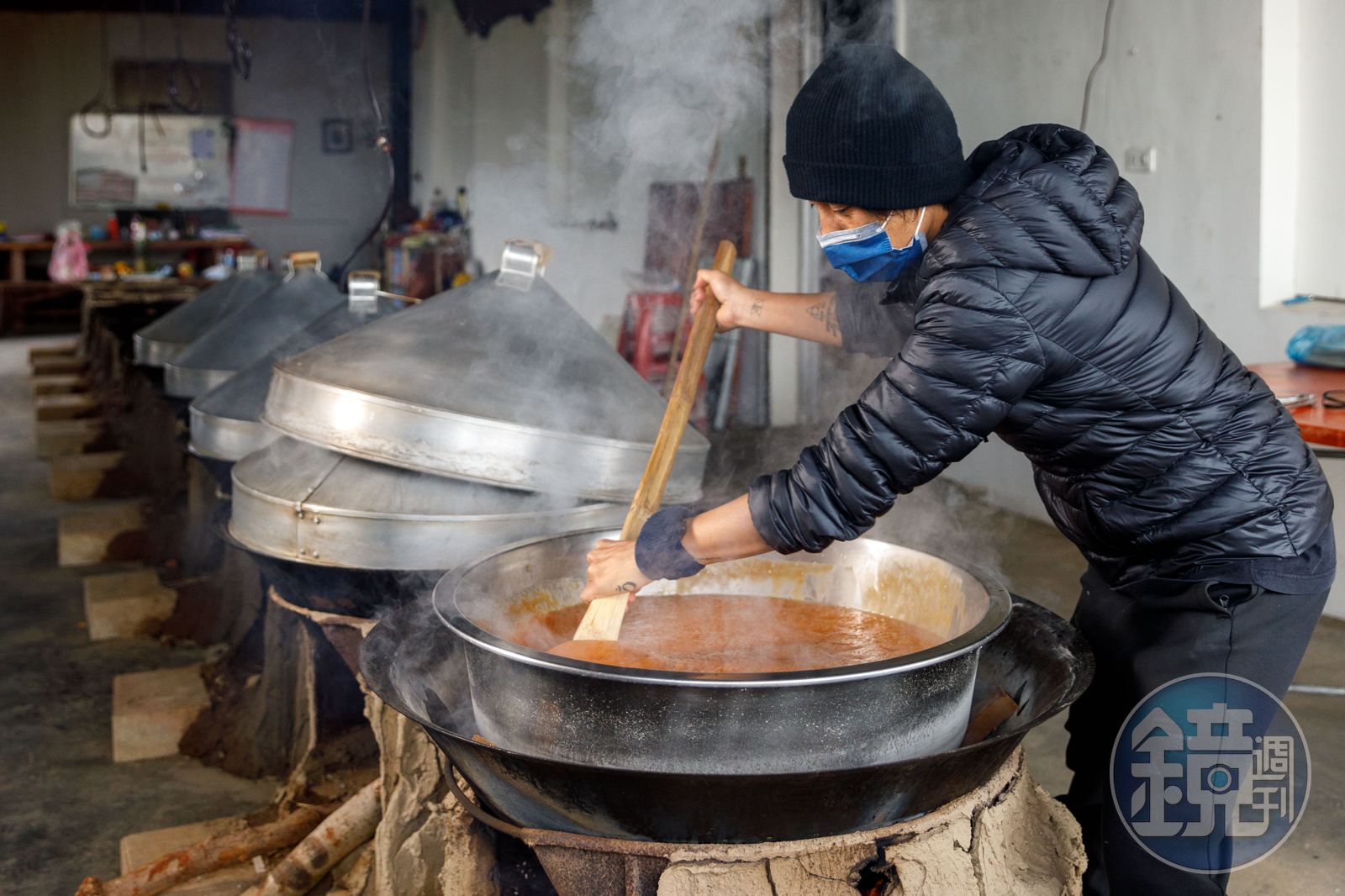 拍攝這天我在上午8點抵達,年糕在昨天上午10點已下鍋,嘉嘉雖然睡不到2小時,心情卻很美麗,笑說:「做年糕會瘦哦,每年都開玩笑說是不是應該先吃胖一點再來做?」我們一起等待開鍋時,她問我要不要試試攪拌?我在爐邊收核心蹲馬步,用竹棒來回攪拌,隨著年糕筋性越來越大,也越來越難攪動,我只好就地投降,換師傅接手,看著他使勁輕巧,我不禁摸摸自己的上臂,真的有痠。