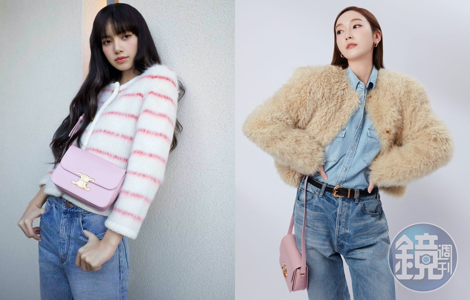 (左起)LISA、Jessica不約而同都選擇毛茸茸上衣與牛仔褲的搭配方式,詮釋Teen Triomphe亮面小牛皮革肩背包。(CELINE提供)發布時間:2023.01.10 16:39 臺北時間
