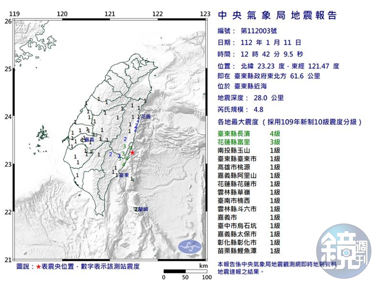 台東縣外海今(11日)12時42分時,發生規模4.8地震,震央位於台東縣近海深28km。台東縣最大震度高達4級、花蓮縣富里3級,1級包含南投縣玉山、台東縣台東市、高雄市桃源、嘉義縣阿里山、花蓮縣花蓮市、雲林縣草嶺、台南市楠西、雲林縣斗六市、嘉義市、台中市烏石坑、嘉義縣太保市、彰化縣彰化市、苗栗縣鯉魚潭。