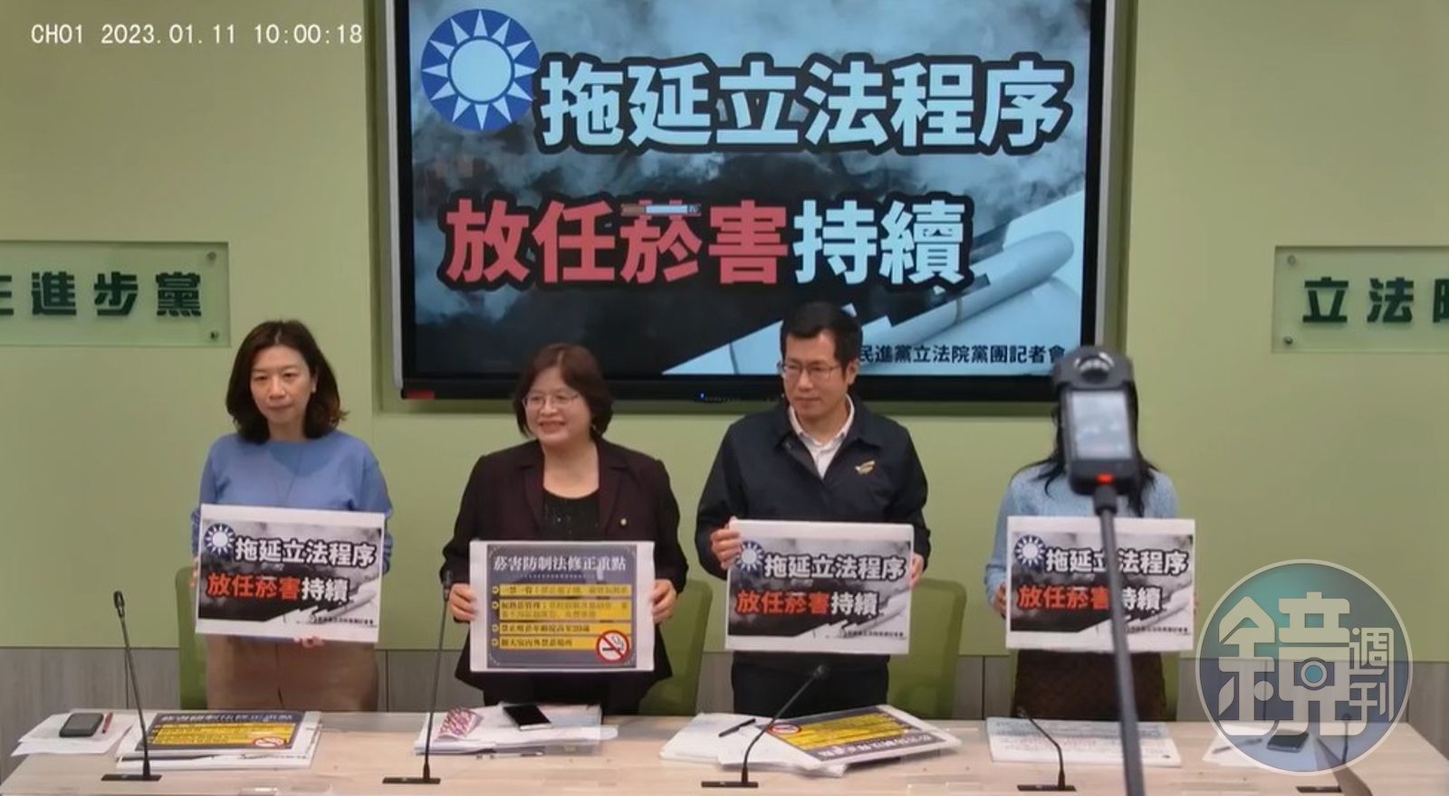 民進黨立院黨團幹事長羅致政及立委吳玉琴、林楚茵、林靜儀,今日上午在立法院舉行記者會,抨擊國民黨不顧朝野協商共識,卡住如此攸關全國人民健康的重大法案。羅致政表示,衛環委員參與協商的委員全部都簽名,國民黨召委林為洲主持5次朝野協商、最重視修法的林奕華委員也都簽字,三黨團委員昨天都簽名同意,毋須表決就可通過,只剩國民黨團幹部,如果今天不簽署,將嚴重影響立法進度。