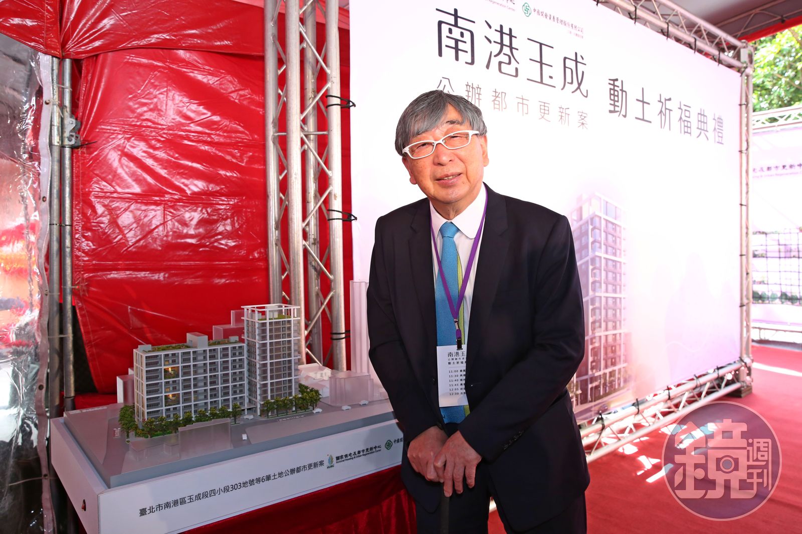 「南港玉成公辦都更案」12日舉行動土祈福儀典禮,由國家住都中心代理董事長花敬群、中國開發資產管理公司董事長鄭重、建築師伊東豊雄共同執鏟。
