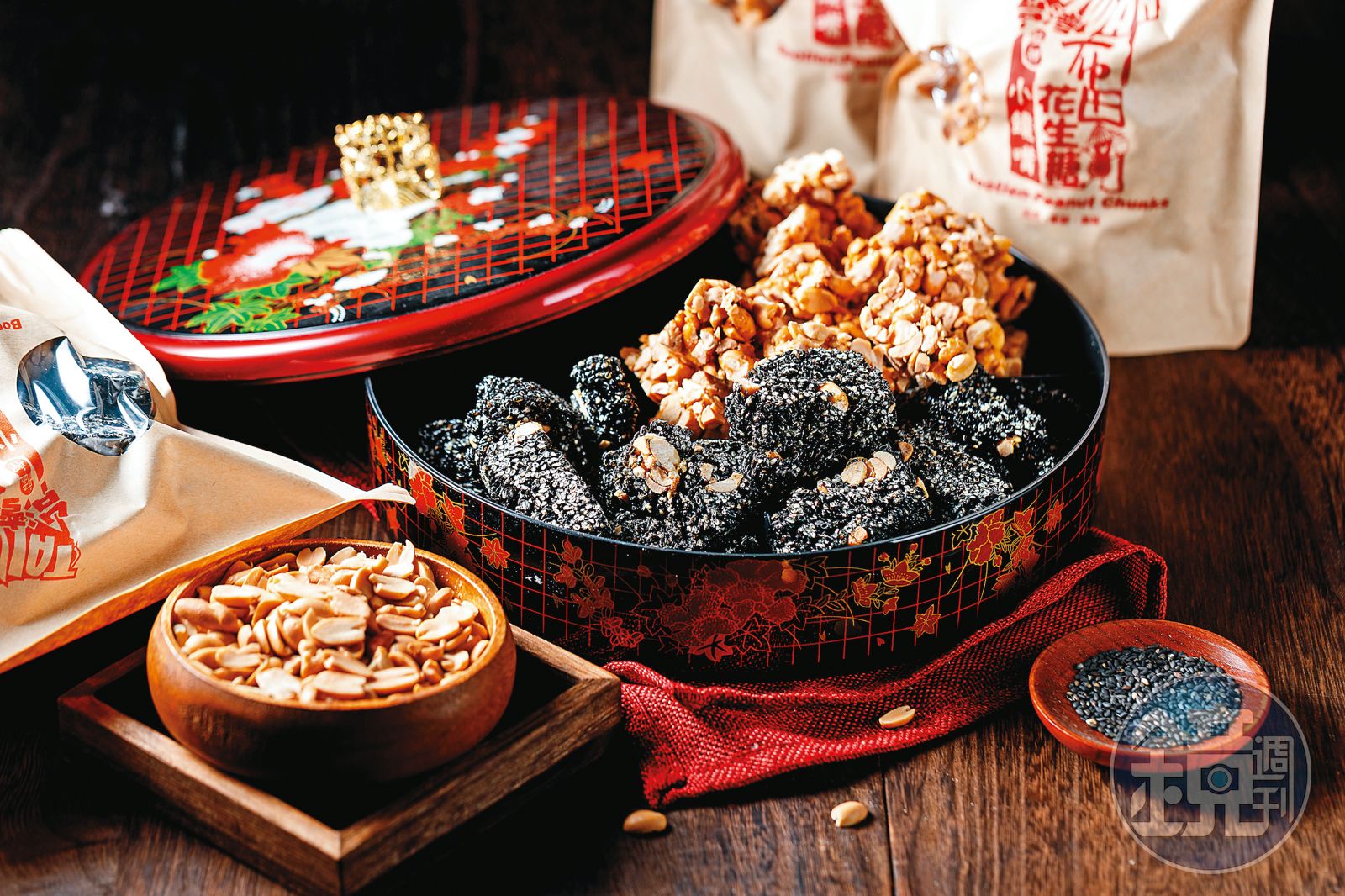 除了吃得到整粒花生芝麻的產品,這兒也有手工製作的「貢糖」,花生與糖漿混合後反覆捶打,直到融為一體,酥香的質地中,是濃濃的花生香氣;而酷愛傳統軟糖的,也可以選擇「花生軟糖」,Q勁質地的麥芽糖裹著香脆花生,形成絕佳對比;而用非油炸米花製成的「香米香」,以及紅糖香氣璞真的「爆薏仁香」,用來餽贈在乎健康的長輩,再適合也不過了。