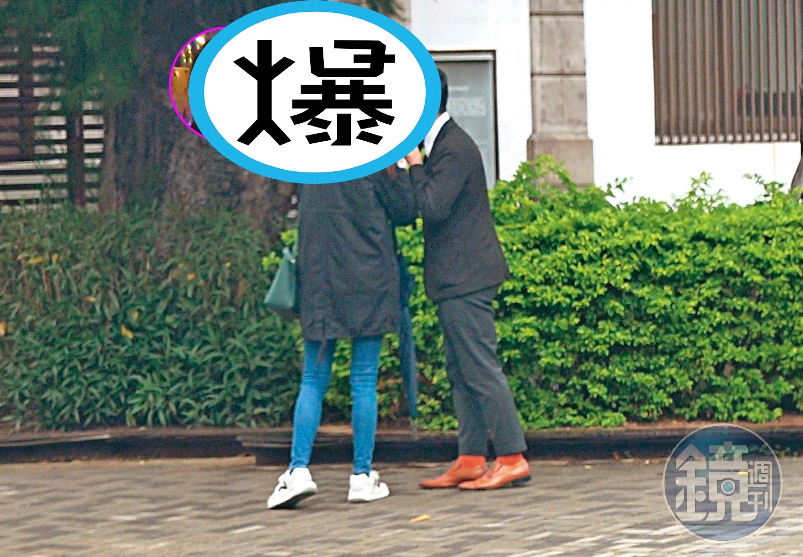 約8時41分左右,謝泊泓與棕髮女子來到新竹市政府側門、中央路及府後路交叉口的「幸福廣場」,才終於停下腳步,2人很有默契地雙雙脫下口罩,還呼應廣場名稱當街熱吻起來,上演一齣「kiss goodbye」戲碼,互道再見後謝才進入市府行政處辦公,貼心送完謝泊泓上班的棕髮女子,此時則略顯落寞地在路旁點起一根菸,邊走邊抽,獨自走向新竹火車站,準備搭車回台北。