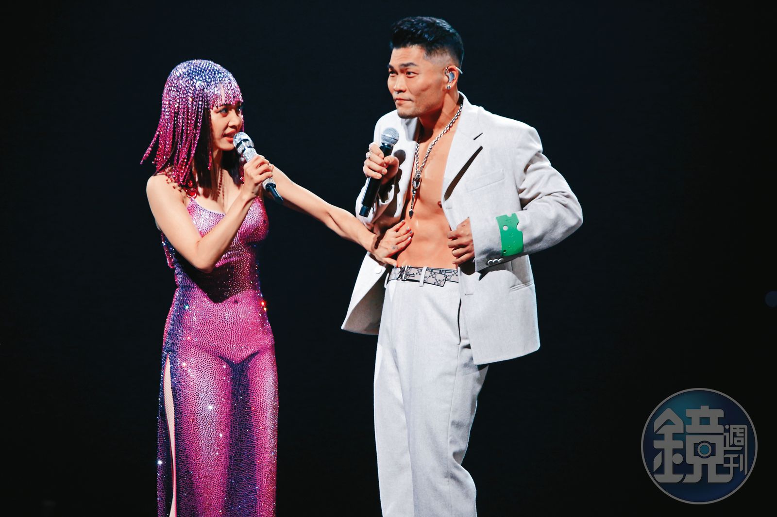設計師利用不同深淺的水鑽製造出身體的曲線,並一顆一顆貼在禮服上,尤其在重點部位鑲上水鑽,讓觀眾都以為蔡依林「激凸」了;第三點的部位則是深紫色水鑽,營造出神祕三角的視覺效果。對此,蔡依林都忍不住笑問歌迷:「你們是來看裸女吼!」