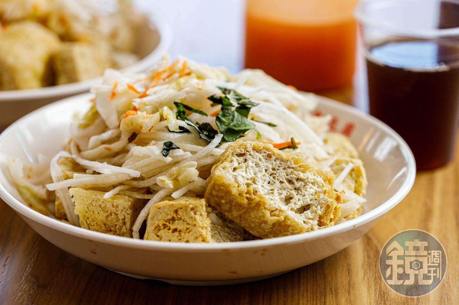 淺淺金黃色的臭豆腐從油鍋中挾起,阿姨再快手剪開,撒上招牌配料新鮮蘿蔔絲、自製台式泡菜、九層塔,咬下外酥內嫩,還會爆汁,選用台東鹿野山區高麗菜醃製而成的台式泡菜,搭著九層塔和爽脆天然甜的西螺白蘿蔔絲一起吃,臭香中透出清香,自煮調配的醬油也不死鹹,的確厲害。嗜辣的人一定要加自製辣椒汁,用鬼椒、朝天椒調製,別看顏色是鮭魚粉橘,以為不辣,其實香辣帶勁,越蘸越涮嘴,喜歡。