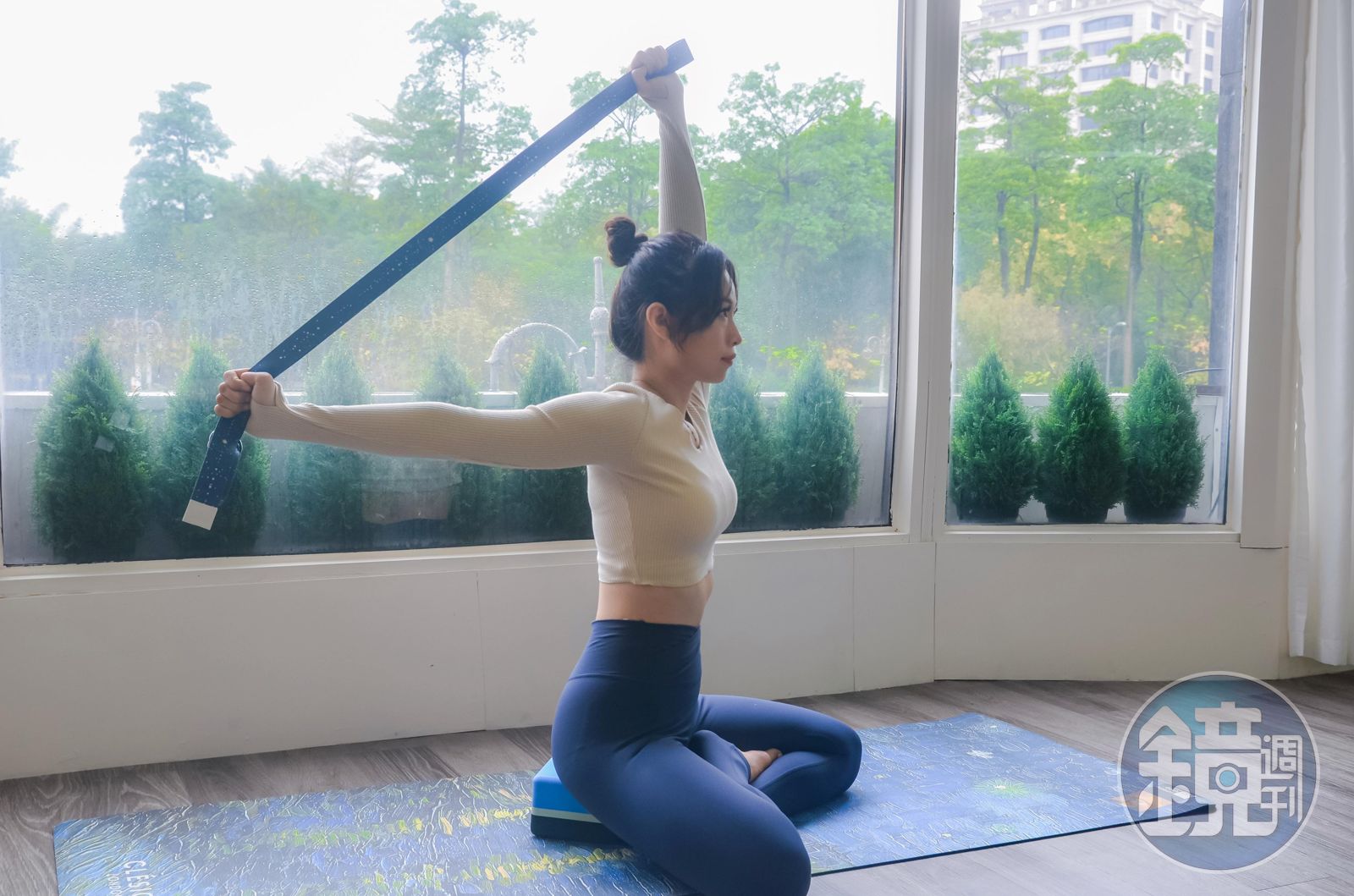 步驟3:持續保持瑜伽繩的張力,右手開始慢慢的往右後方伸直,盡可能讓右手來到右肩膀的正後方,盡量讓左右手呈90度角,如果感受太多,可以將右手往右斜後方伸直就好。