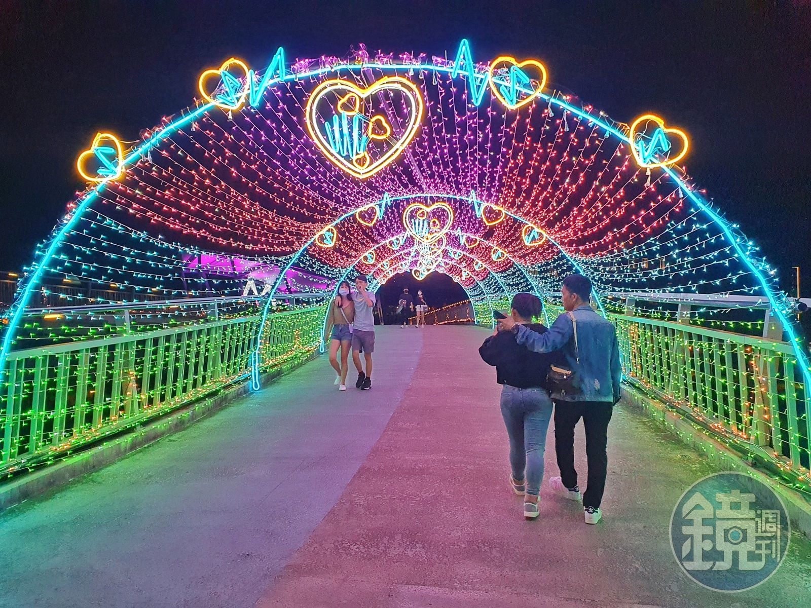 今年首次布展夜間光雕的新店陽光橋,循著燈海的方向,兩側的路樹裝置甜蜜色系燈串,點綴成迎賓大道,一路延伸至陽光橋上,讓夜晚的陽光運動公園同樣展現風情迷人的浪漫氣氛,情人手牽著手漫步其中,幸福滿滿情感加分。
