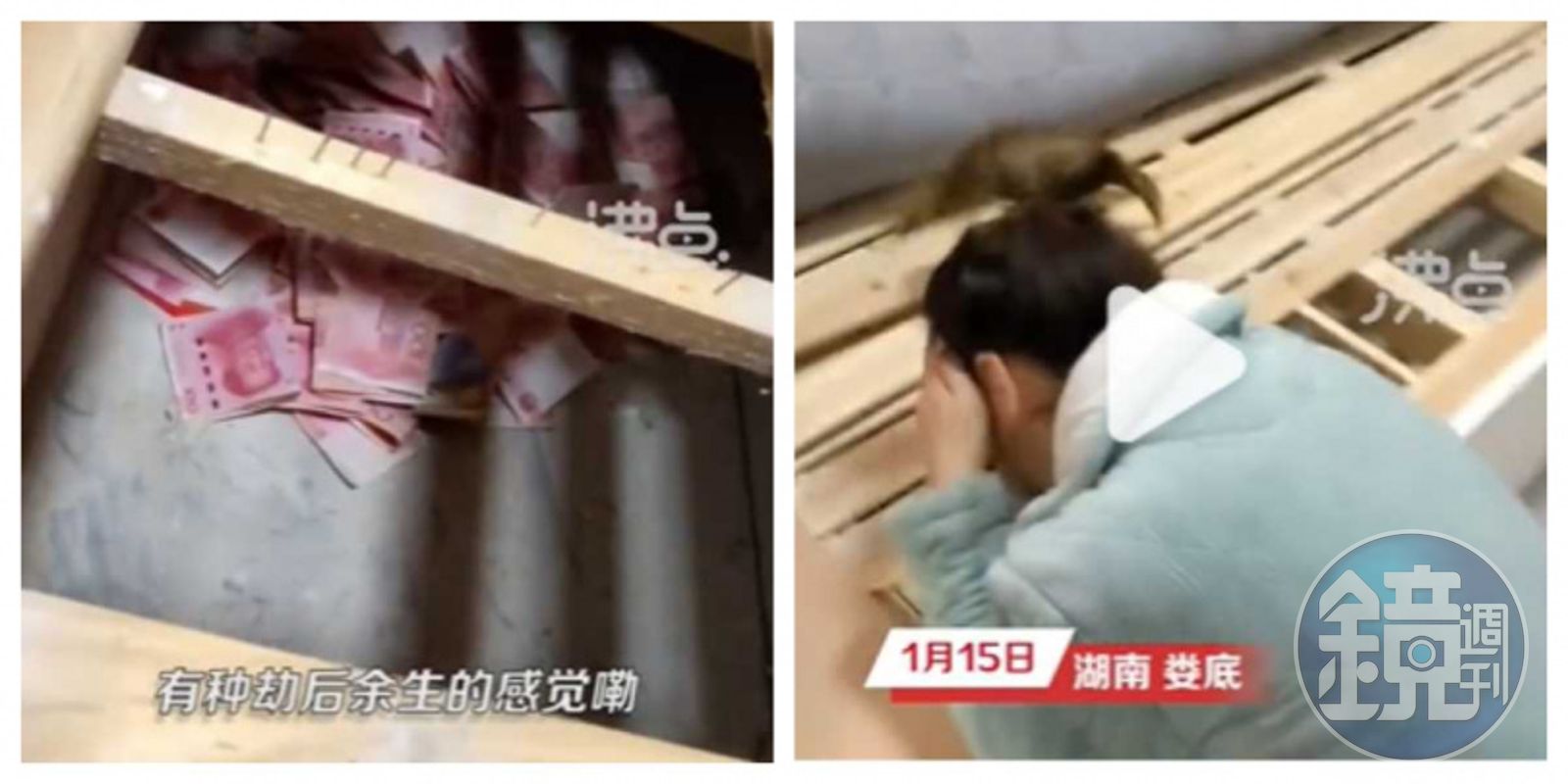 中國湖南婁底一名人妻趕著年前大掃除時,意外發現老公藏在床底的私房錢,而人妻看到大票的鈔票,一度笑到需要扶床。對此,丈夫透露當時在房外的他,聽見老婆在房內的笑聲,「心裡當下抖了一下」,跑過去看果然發現妻子的心思全在她的私房錢上面。