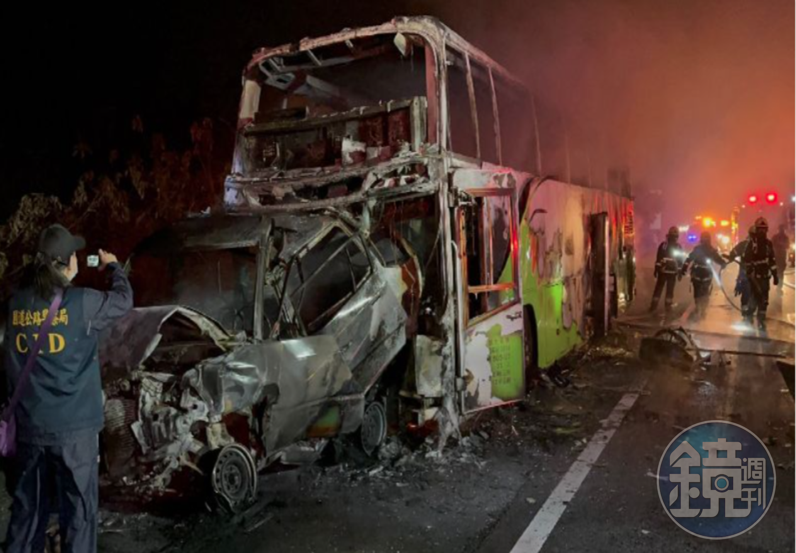 國道1號北上頭屋路段發生一起嚴重的火燒車事故,釀成2死9傷悲劇。(翻攝畫面)發布時間:2023.01.23 11:20 臺北時間