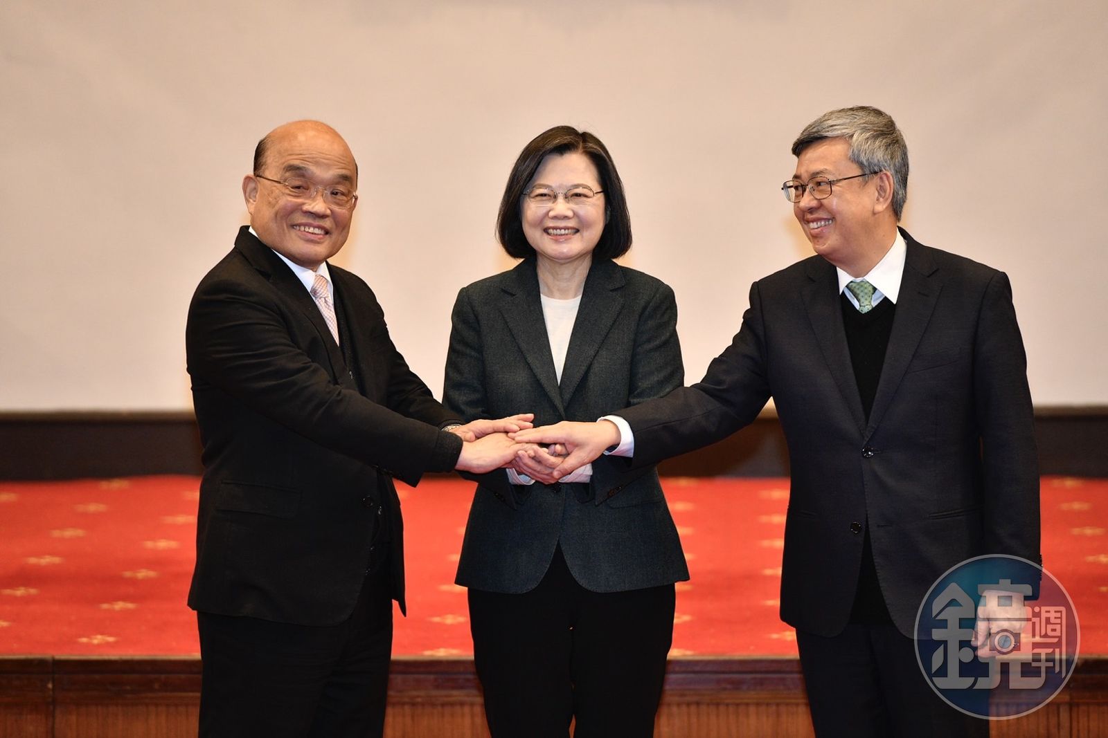 蔡英文表示,她對蘇貞昌充滿感激,從接任那一刻起,忍辱負重、任勞任怨任謗,用意志力、執行力撐起行政團隊,「他幫我扛起許多壓力,讓我有更多力量專任在外交國防事務」,蔡英文說,蘇貞昌有一句名言,「人生劇本早就寫好的,但沒有辦法偷看」,選後蘇貞昌幾度請辭,他用每一天努力為台灣,「蘇貞昌就是最有魄力、最有執行力、最會做事的行政院長」。