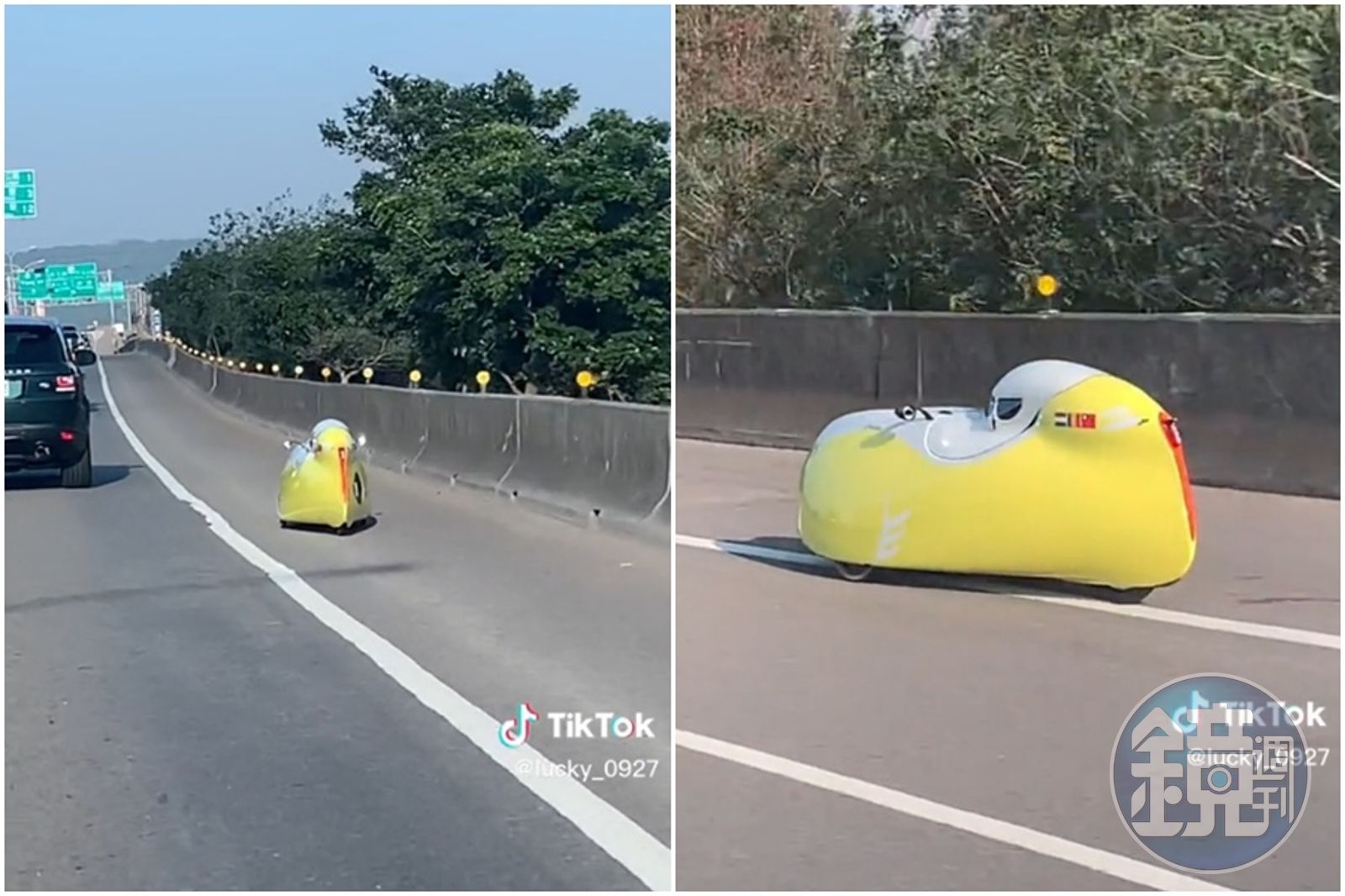 原PO在TikTok分享在西濱道路某處目擊一輛全覆式自行車,外觀像是「黃色小鴨」的車子在路上行駛的影片,畫面中可見,路上有行經前往竹北市區的標示牌,這輛車的高度只有一般汽車的1/3,體積也相當迷你,在路上很容易被汽車駕駛忽略,一不小心恐發生碰撞事故。