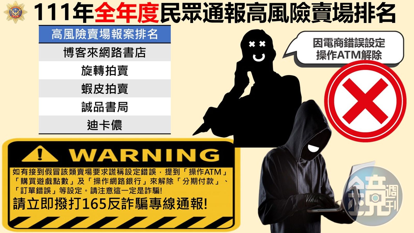 針對高風險賣場,刑事局除每週發函通知針對被害件數逾5件的疑似個資外洩電商,並附上電子商務業者防制詐欺作為自評表、官方網頁明顯處加註反詐騙警語、網頁標明客服專線及客服時間、針對會員發送反詐騙提醒簡訊、延長客服時間至22時等相關作為範例、簡訊範例供參考,更要求賣場業者強化資安防護措施,並於網頁置放反詐騙宣導;同時透過165各宣導管道(165全民防詐網、臉書粉絲專頁及警政服務App)定期公布高風險賣場,提醒消費者提高警覺,慎防詐騙。