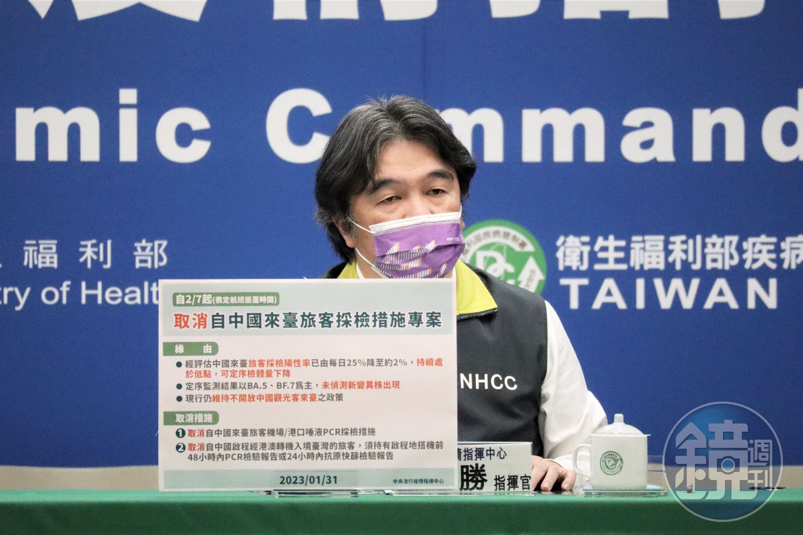 王必勝表示,自中國入境台灣的旅客陽性率自20多%到現在2%,定序監測結果也未發現新變異株出現,監測結果以BA.5、BF.7為主,且現行仍維持不開放中國觀光客來台,與其他國家有差異,因此宣布2月7日起取消自中國來台旅客唾液篩檢,同時也取消自中國啟程經港澳轉機入境台灣旅客搭機前得出示陰性證明;王必勝補充,自中國入境台灣的旅客大多為本國人。