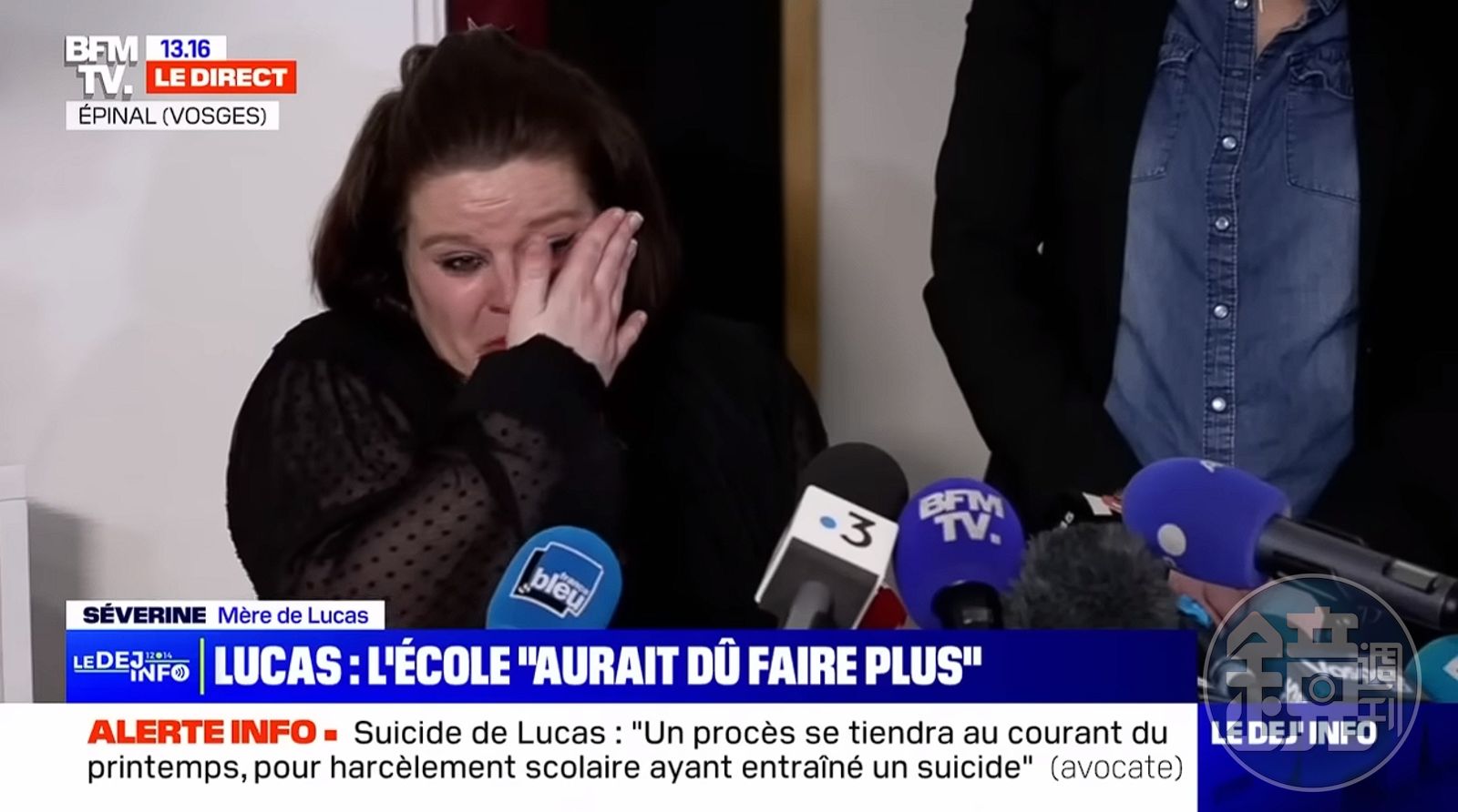 綜合外媒報導,位在法國東北部城鎮埃皮納勒(Épinal)一名35歲的婦女瑟芙林(Severine)近日受訪表示,他的兒子盧卡斯(Lucas)今年1月初自縊身亡,檢察官稱他「由於同性戀身分在學校被欺負了幾個月」。瑟芙林痛訴,她認為霸凌是導致兒子輕生的因素。