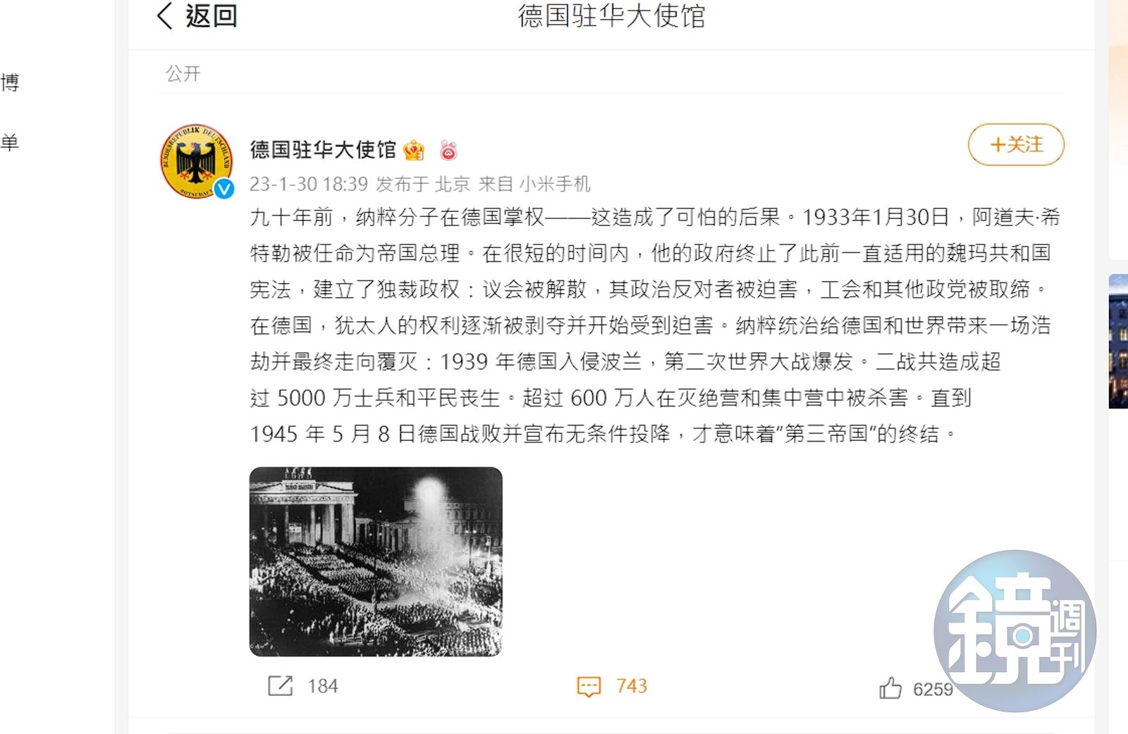 德國駐中國使館的微博帳號「德國駐華大使館」1月30日發文回顧德國歷史,指出1933年的1月30日這一天,希特勒被任命為帝國總理,隨後他的政府終止了威瑪共和國的憲法,建立獨裁政權,解散議會、迫害政治反對者。