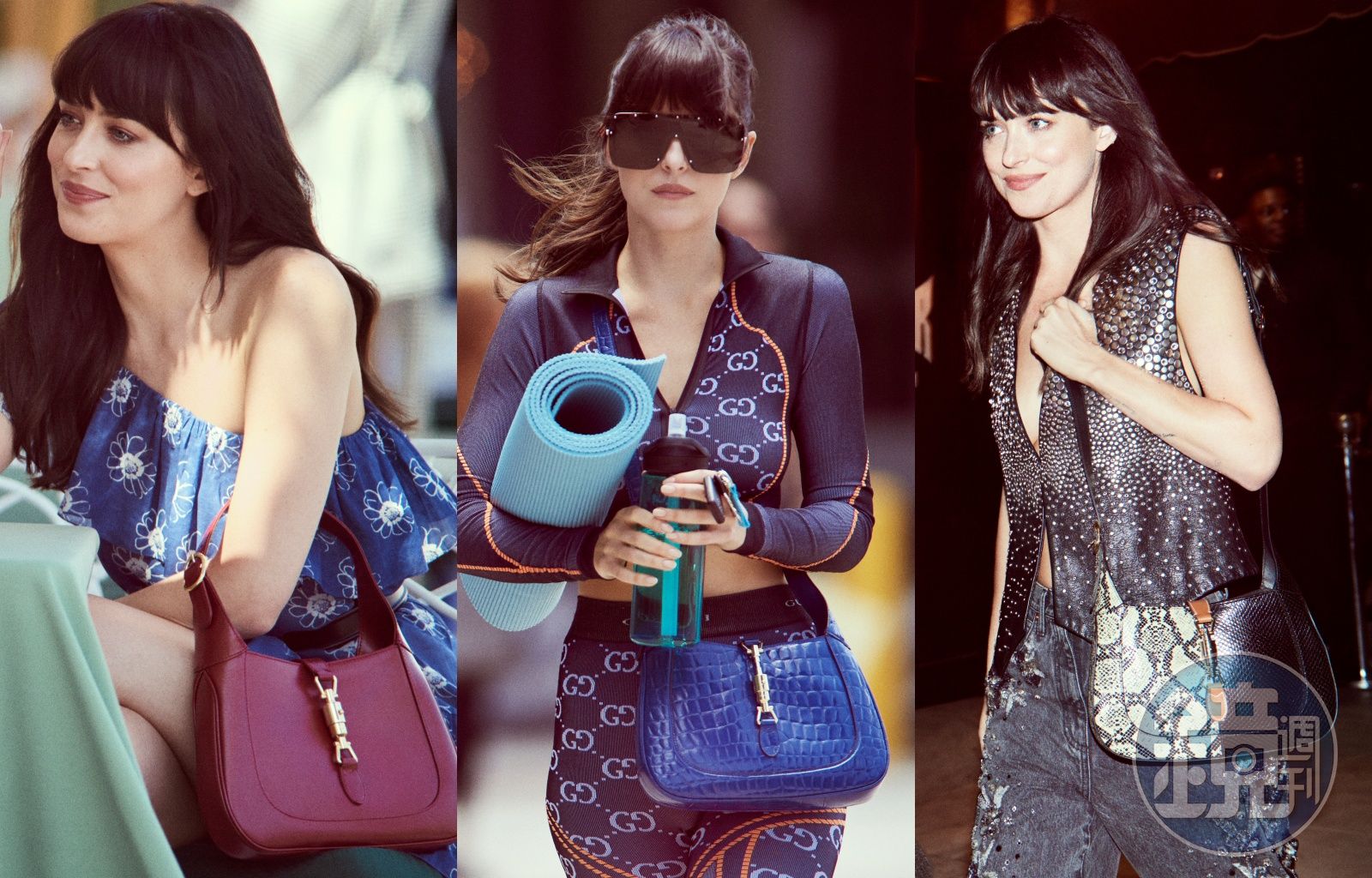Dakota Johnson所拍攝的廣告大片,以身在洛杉磯的日常時刻,完美展現不同款式的Jackie 1961包款。(GUCCI提供)發布時間:2023.02.02 21:23 臺北時間