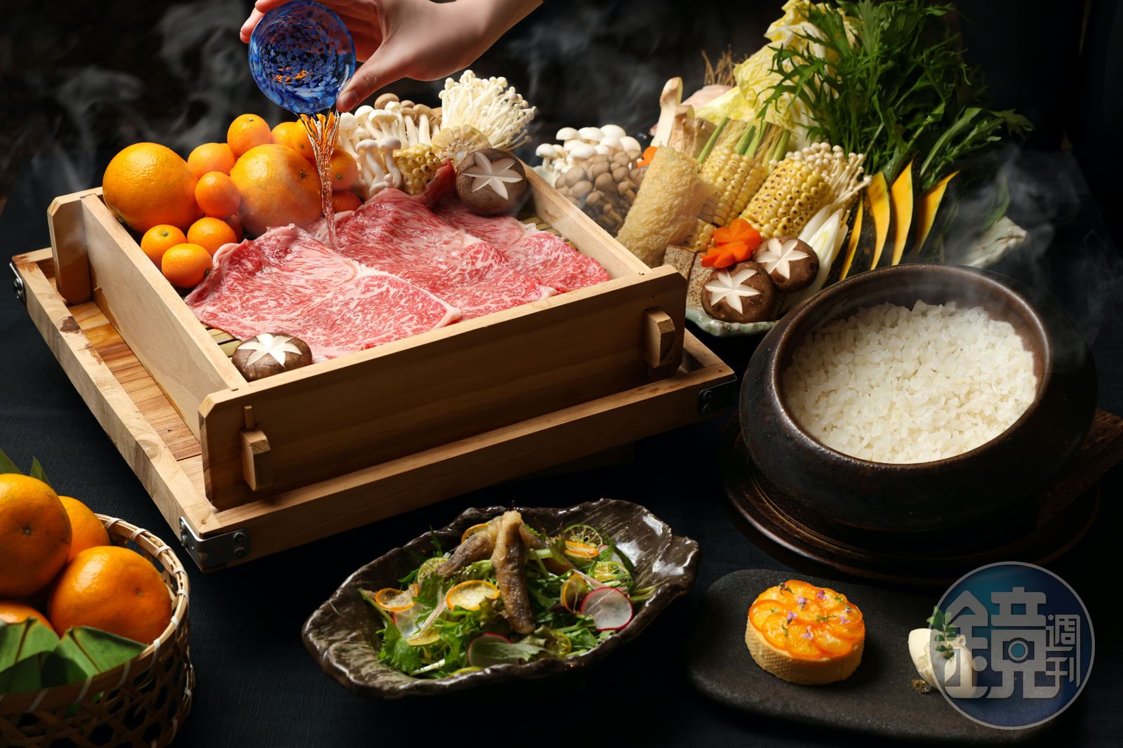三燔本家也推出「宮崎和牛金桔套餐」,主菜「宮崎A5和牛柑橘燒酎蒸籠蒸」用三燔招牌的蒸籠蒸手法,在手工製作的方形杉木蒸籠中鋪上油花勻稱的A5宮崎牛,湯底使用糖度高達18的完熟金桔,與九州黃金柚子調和出的昆布柴魚高湯,高溫蒸煮開蓋,再噴灑帶清甜香氣的柑橘燒酌,捲進主廚特製的金桔醬,搭配切片完熟金桔,蜜甜馥郁,美味度值得給一個大拇哥。