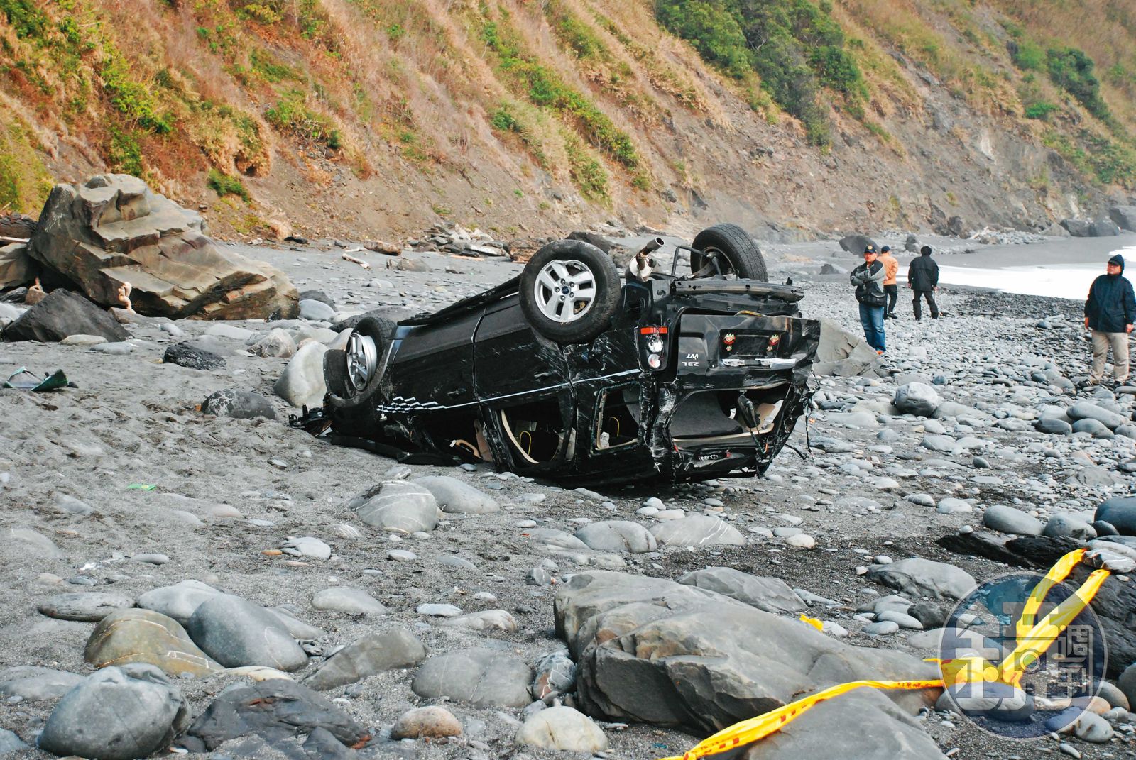 辦案人員遠遠看到斷崖下、沙灘上,有一輛休旅車四輪朝天,旁邊還有一具屍體,應該是車子滾落崖下時彈出,但當時天色已晚,警方於是請消防局人員架起探照燈,漏夜採證。