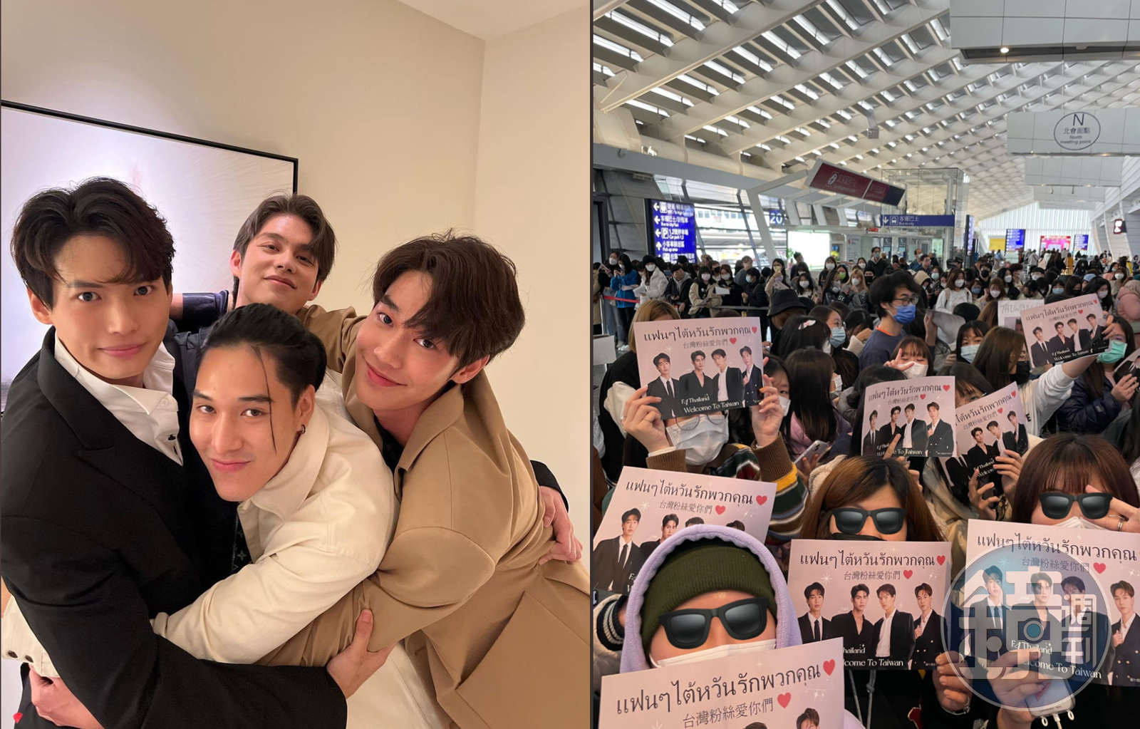 泰國F4來台灣,Bright(後)吃餅乾的工作態度惹議。而大批粉絲去機場接機也撲空。(翻攝自推特)發布時間:2023.02.06 10:30 臺北時間