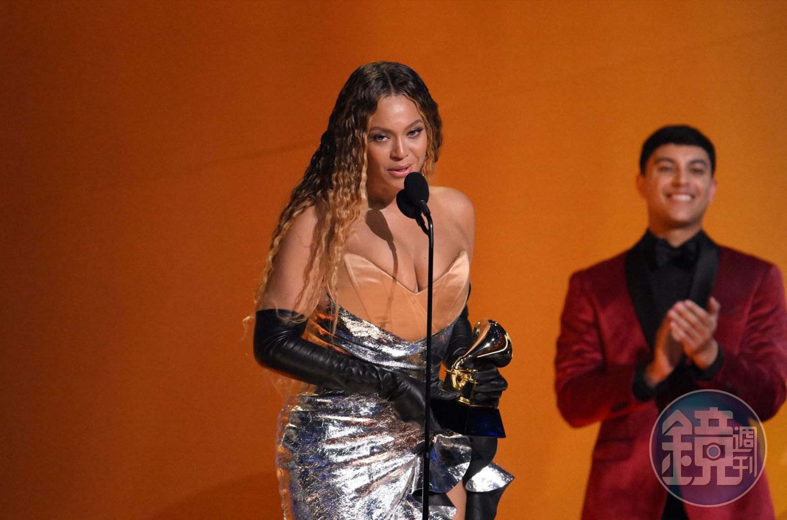 以大尺碼身材走紅樂壇的歌手麗珠(Lizzo),以單曲〈About Damn Time〉拿下最大獎年度唱片的殊榮,她上台時對著台下的碧昂絲大喊,「我曾蹺課去看妳的演唱會,妳改變了我的人生。妳帶給我的能量,我想傳達給更多人,妳就是我們生命中最偉大的藝術家!」這段感言,簡單來說,就是「我從小聽妳的歌長大!」