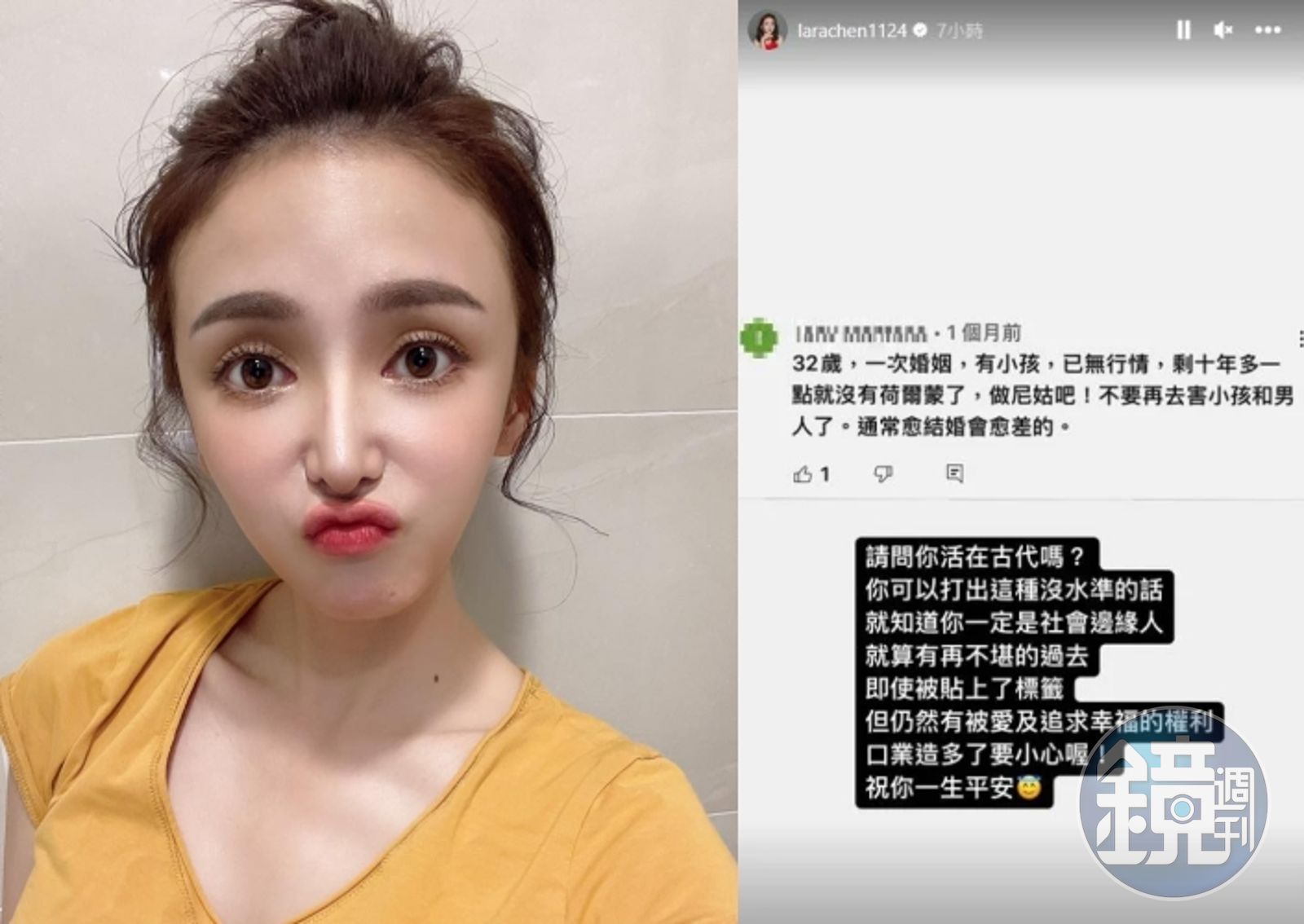 該名酸民全文寫下:「32歲,一次婚姻,有小孩,已無行情,剩十年多一點就沒有荷爾蒙了,做尼姑吧!不要再去害小孩和男人了。通常愈結婚會愈差的。」極酸的發言也惹到陳子玄在IG限時動態截圖反擊。