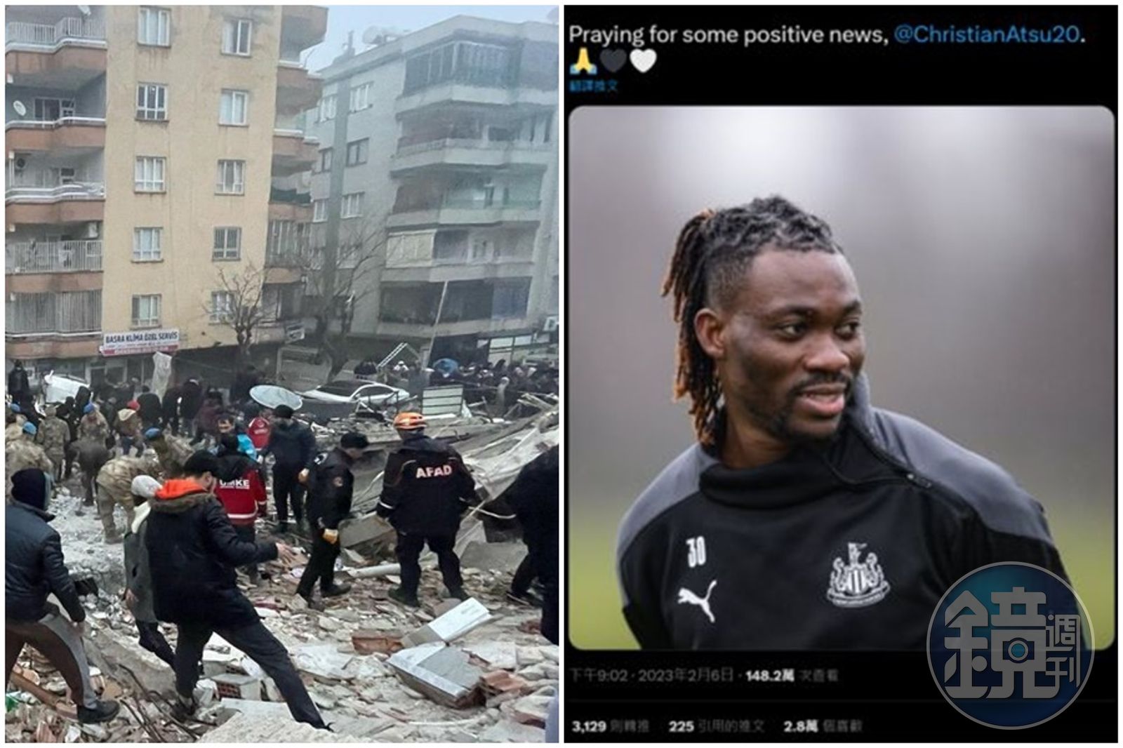 綜合外媒《BBC》《Sky News》等英媒報導,31歲阿特蘇是加納國家足球隊成員,曾效力英超紐卡索聯足球俱樂部(Newcastle United)等多支英超球隊,並於2022球季轉會至土超哈塔伊體育(Hatayspor),而該隊主場就位於受災嚴重的土耳其邊境城市安塔基亞(Antakya)。由於地震後阿特蘇與多名球員傳出失聯,讓外界擔憂失聯球員們恐被活埋。對此,阿特蘇前東家紐卡索聯、伯恩茅斯等官方推特都發文祈求他能平安。