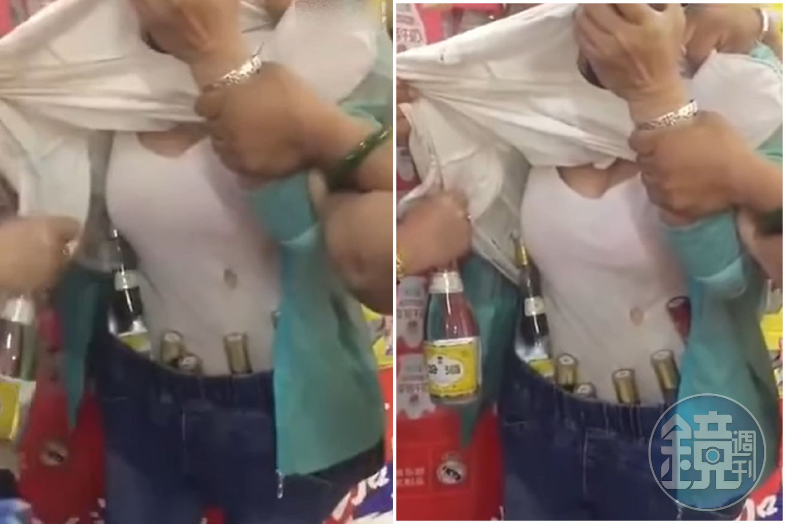 中國網友近日討論一段影片,影片可見一名大媽到賣場,被工作人員發現「身體怪怪的」,隨即對她搜身。大媽寬鬆的外衣被掀開後,這時發現大媽的腰間竟然插著一支又一支的酒,原來大媽利用褲子的鬆緊帶,企圖把酒塞進腰際間,並利用寬鬆的上衣遮掩,企圖把數瓶酒夾帶闖關偷走。