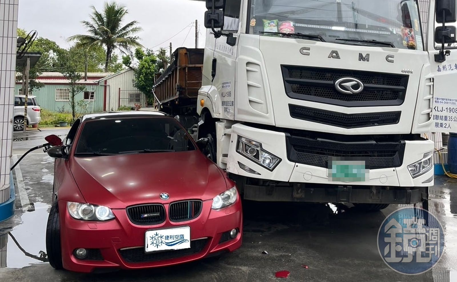 紅色BMW到花蓮某加油站加油時,遭曳引車擦撞騎上去。(翻攝自爆廢公社二館)近日有位高姓網友於臉書社團「爆廢公社二館」po文,曬出多張紅色BMW M3敞篷車遭曳引車擦撞騎上去的照片,可見車身上的紅色包膜直接被刮出白色烤漆及板金,後照鏡也直接被撞歪,甚至連左側前方的車殼都被撞破。