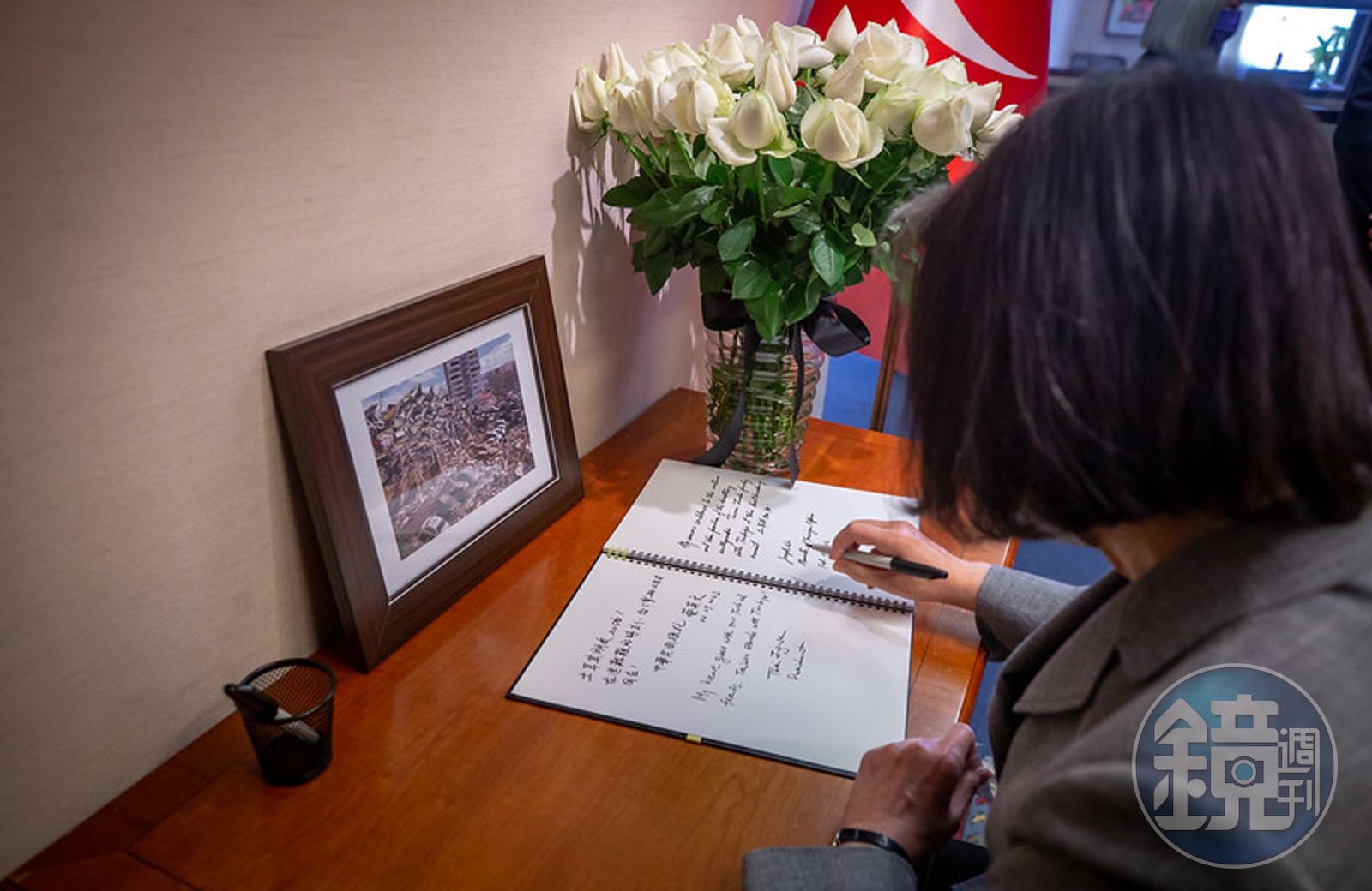 總統府指出,蔡英文今午前往駐台北土耳其貿易辦事處,代表我國政府及人民向土國駐台代表貝定可(Muhammed Berdibek)表達誠摯關心與慰問,並在哀悼簽名簿以中、英文親筆寫下:「土耳其朋友加油!在這艱難的時刻,台灣與土耳其同在!My heart goes with our Turkish friends. Taiwan stands with Türkiye!」